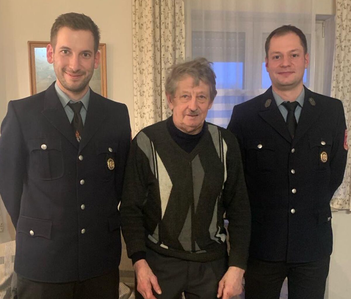 Am Nachmittag marschierten die beiden Vorsitzenden der Feuerwehr Spielberg, Thomas Schwab und Josef Stangl am Schneiderdickn-Anwesen in Schönbrunn auf, gratulierten herzlich und überbrachten dem Jubilar einen Geschenkkorb. Zur Überraschung hatten sie auch eine Ehrenurkunde dabei und haben dabei den früheren aktiven Spielberger Feuerwehrmann aus Schönbrunn, der seit 60 Jahren bei der Wehr ist, zum „Ehrenmitglied der Feuerwehr Spielberg“ ernannt.