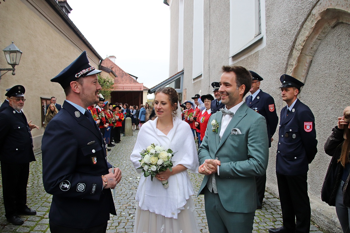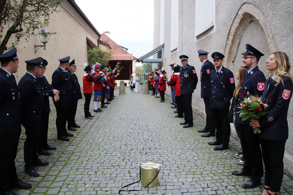 Ein ganz besonderer Tag für den Spielmannszug und die Stadt Pressath: Am Samstag gaben sich Julia Ackermann und Tobias Höfer, beide wohnhaft in Pressath, das Jawort – zunächst im Standesamt, später bei einer festlichen kirchlichen Trauung. Beide sind Mitglieder im Spielmannszug der Feuerwehr Pressath, Tobias ist hier der Vorsitzende.