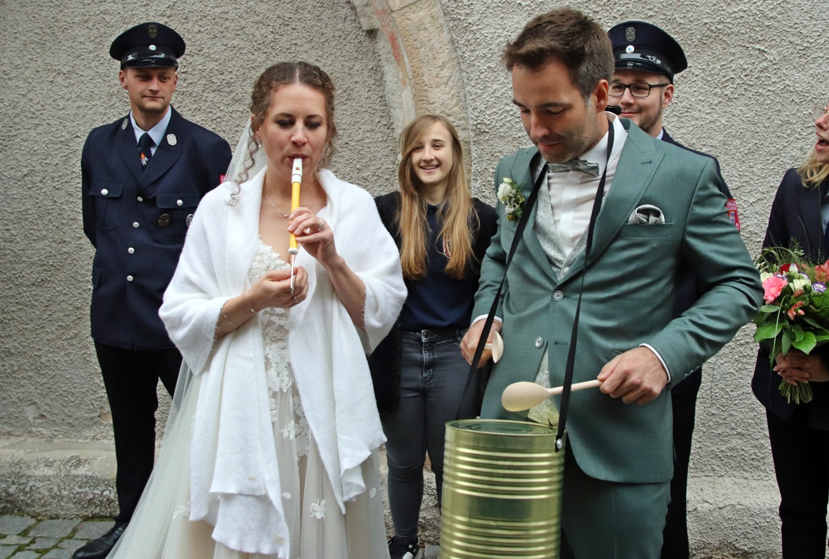 Am Nachmittag folgte die kirchliche Trauung, die von festlichen Klängen des Chores „Herzstück“ aus Grafenwöhr umrahmt wurde. Vor der Kirche warteten bereits die Musikerinnen und Musiker des Spielmannszuges Pressath sowie befreundete Mitglieder aus Erbendorf. Auch die Freiwillige Feuerwehr Pressath stand Spalier und überraschte das frisch vermählte Paar mit einer kleinen musikalischen Aufgabe, die Julia und Tobias mit viel Freude meisterten.