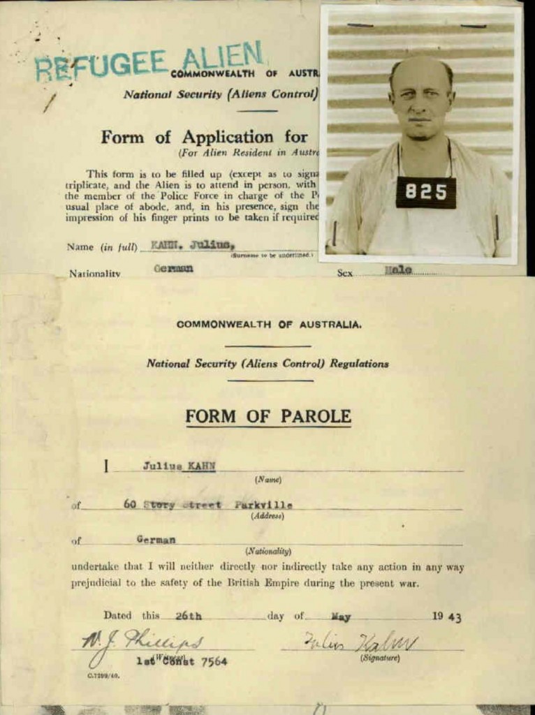 Die Bedingungen der 57-tägigen Überfahrt werden als unmenschlich beschrieben. Das Schiff ist überfüllt. Es gibt kaum Schlafplätze. Die Wärter sind brutal. Es ist nicht genug Nahrung an Bord. Krankheiten brechen aus. Im September 1940 kommt das Schiff in Sydney an. Julius Kahn und Hugo Hutzler werden mit 1000 deutschen und österreichischen Juden in Zügen ins Internierungslager “Camp Hay” gebracht. Sie sitzen im Staub der australischen Wüste von New South Wales fest. In Baracken zu je 28 Mann.