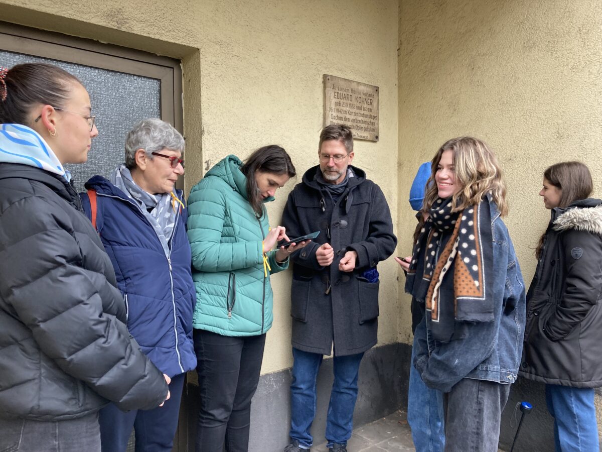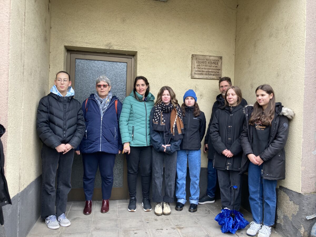 Das trifft sich gut: Denn Nachfahren der Kohners sind derzeit in der Stadt zu Gast. Michal und Hila Kohner aus Tel Aviv sind mit Werner Friedmann (Gesellschaft für christlich-jüdische Zusammenarbeit) verwandt. Sie wohnen der Verlegung bei und kommen schnell ins Gespräch mit der Schülergruppe und ihrem Lehrer Björn Sommer.