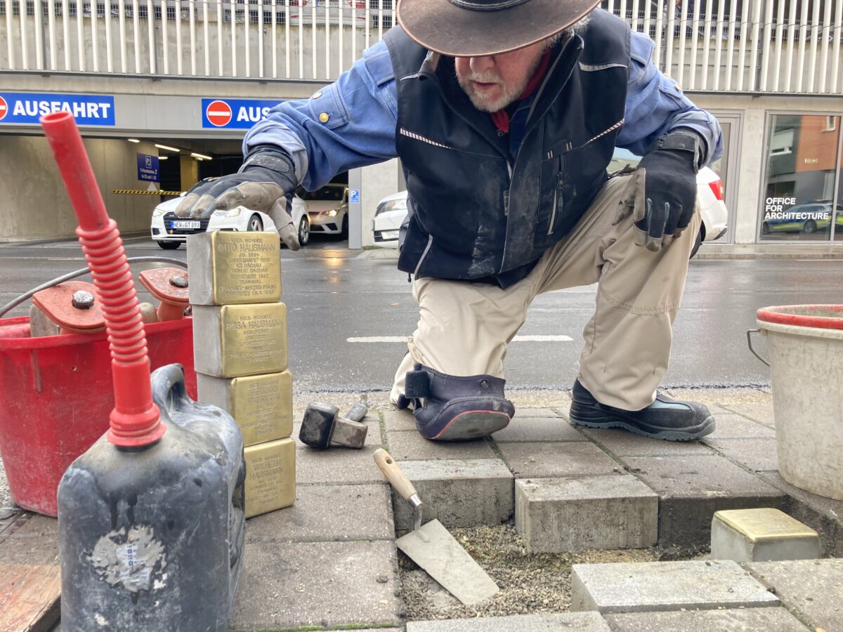 Künstler Gunter Deming versenkt die Steine mit Routine im Trottoir. 105.000 Steine in 31 Ländern haben er und seine Mitarbeiter inzwischen verlegt. “Das klingt viel”, sagt er, sei aber in Anbetracht der 6 Millionen Holocaust-Opfer doch nur ein kleiner Teil.