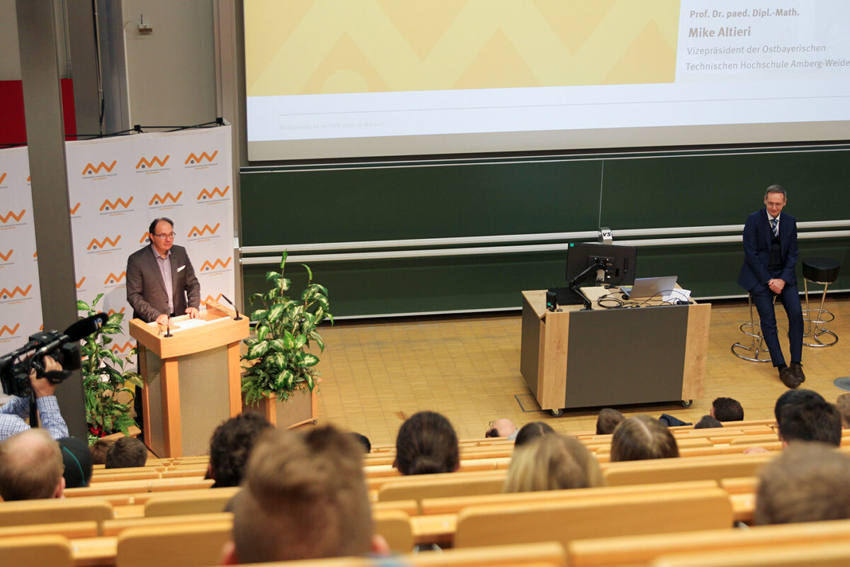 Parallel zur zentralen Begrüßung in Weiden empfingen am Amberger Campus Oberbürgermeister Michael Cerny und stellvertretender Landrat Michael Rischke für den Landkreis Amberg-Sulzbach sowie Vizepräsident Prof. Mike Altieri die neuen Studierenden. Letzterer betonte in seinen Grußworten vor allem: „Mir ist ein besonders großes Anliegen, dass Sie unsere Hochschule von ihrer persönlichen Seite kennenlernen. Neben exzellenter Lehre ist das sicherlich eines unserer Alleinstellungsmerkmale: Wir sind eine kleine, familiäre Hochschule, an der Sie jederzeit auf Ihre Lehrenden und die Ansprechpersonen der zentralen Einrichtungen persönlich zugehen können.“