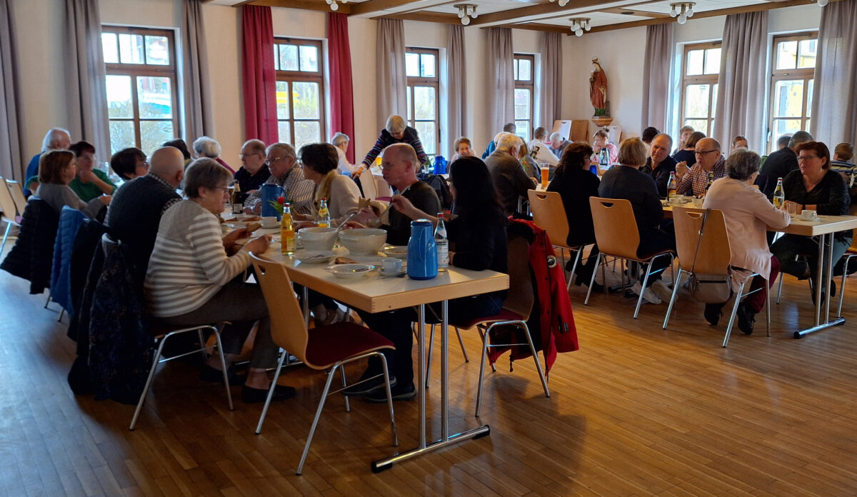 Geschält und geschnitten werden mussten rund zwei Zentner Kartoffeln, Karotten, Fenchel, Sellerie und die Wursteinlage. Am frühen Sonntagmorgen wurde die Kartoffelsuppe dann in drei großen Töpfen gekocht. Obwohl einige Stühle im Pfarrheim leer blieben, wurde die Kartoffelsuppe gut angenommen. Zahlreiche Portionen wurden auch mit nach Hause genommen. Ein großes Dankeschön geht an alle treuen Unterstützer. Der Reinerlös kommt Missionsprojekten zugute.