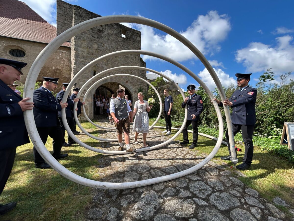 Die Feuerwehr Döllnitz mit dem Vorsitzenden Johann Kellner gratulierte, denn hier rückte einst Thomas mit aus. Die Leuchtenberger Feuerwehr hatte mit einem Schlauchspalier Position bezogen. Vizekommandant Gerd Scharff gratulierte im Namen der Wehr, denn hier sorgt Lisa dafür, dass die Kasse stimmt. Auch bei der Soldaten- und Reservistenkameradschaft ist Thomas Mitglied, dafür überbrachte Vorsitzender Bernhard Kammerer die Glückwünsche und ließ dazu die Böller krachen.