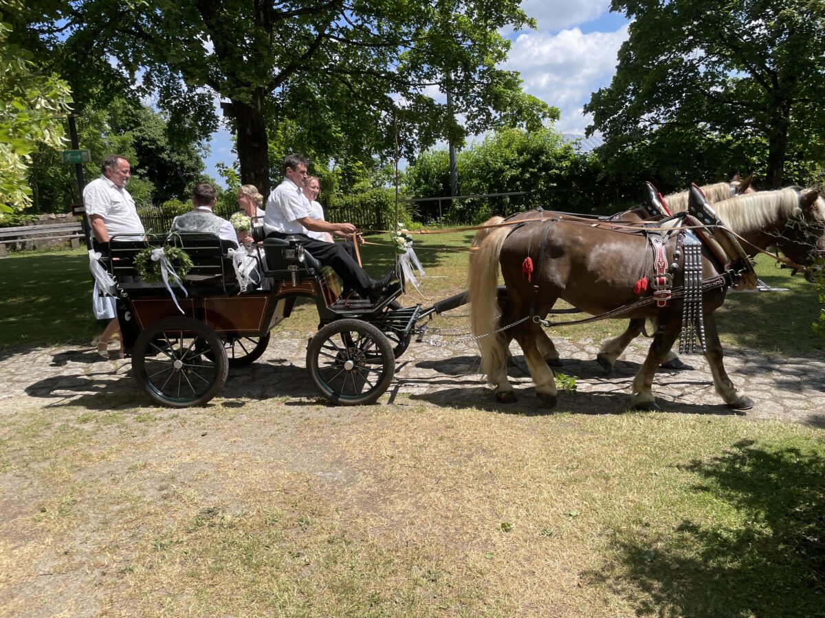 Bürgermeister Anton Kappl nahm den Beiden in der Burg das Eheversprechen ab. Beide hatten sich einst über die Katholische Landjugendbewegung (KLJB) kennengelernt. Lisa machte damals vor über einem Jahrzehnt mit der KLJB Seniorenbesuche, eben auch bei Thomas Oma in Döllnitz. Der Funke sprang über und sie wurden ein Paar. Nach der Trauung standen viele Gratulanten und Abordnungen von Vereinen vor der Burgkapelle, um die frischgebackenen Eheleute zu beglückwünschen. Von der DB-Netz AG waren die Arbeitskollegen des Bräutigams gekommen, um persönlich dem Brautpaar zu gratulieren.