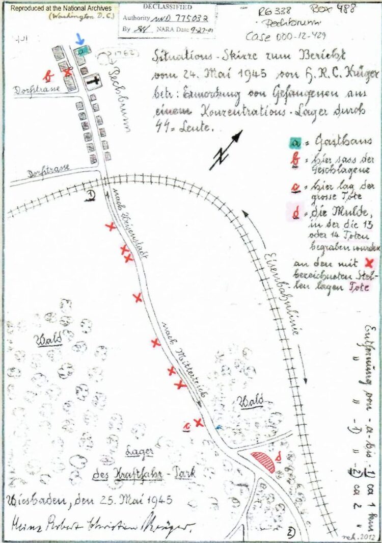Zeuge Krüger darin unter anderem: “Der Zug bestand aus 800 bis 1000 Männern … mit ca. 20 SS-Leuten und einigen Hunden. Nach meinen und anderen Augenzeugen Eindruck waren es teils Ausländer, teils Juden und Deutsche. Einige waren mir als Russen oder als typisch slawisch erkennbar.” Er fertigt auch eine Zeichnung an: “In der beiliegenden Skizze habe ich die Stelle bezeichnet, wo die 12 oder 13 Leichen aus dem Gefangenenzug begraben sind…. Ich schwöre bei Gott, dass dies die reine Wahrheit ist. gez. Heinz Robert Christian Krüger Wiesbaden, 25. Mai 1945”.