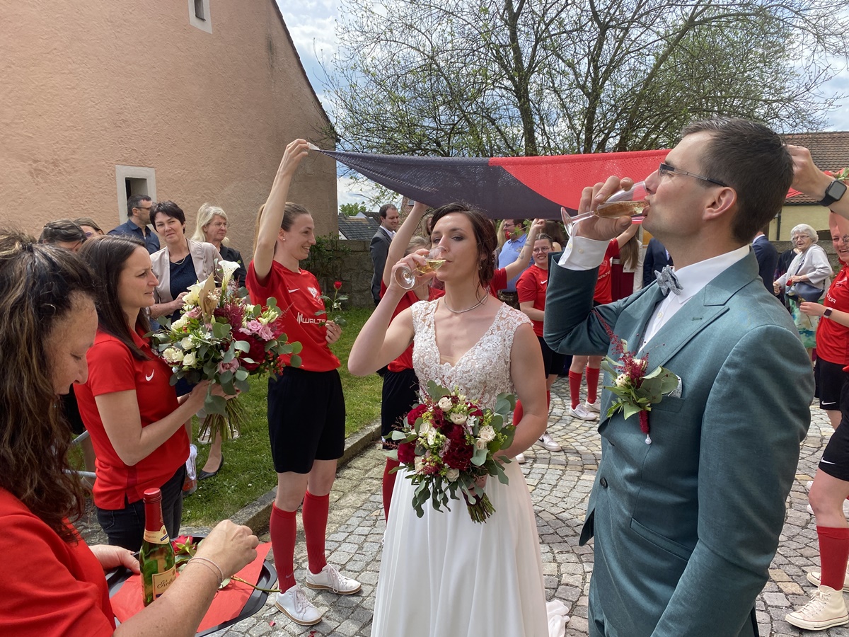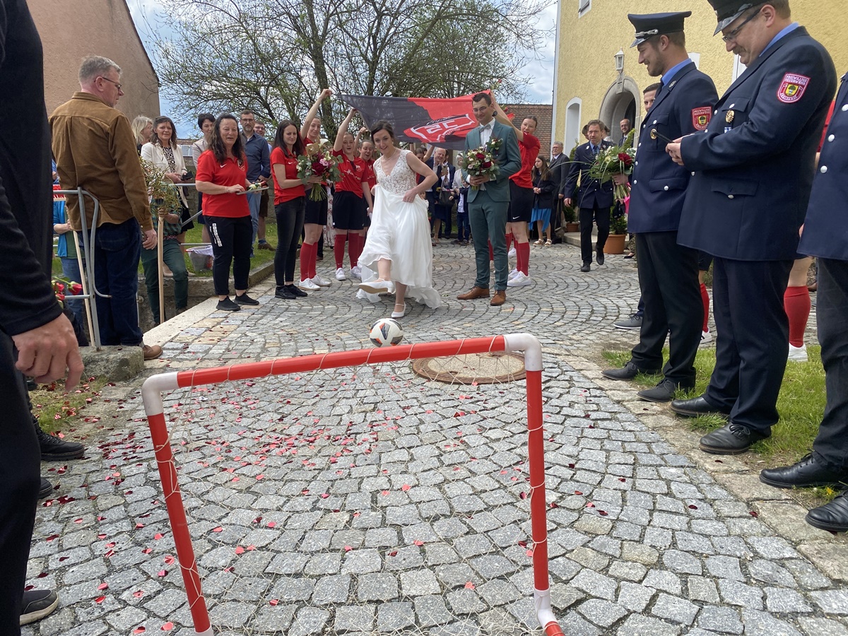 Nachdem sie das von den Mannschaftskameradinnen gebildete Spalier durchschritten hatten, musste das jungvermählte Paar erst einige Aufgaben bewältigen. Zuerst einen Schluck SC Sieger-Sekt und danach aus 11 Metern ein kleines Tor treffen waren die Aufgaben. Hier zeigte Ramona und auch Matthias, dass beide treffsicher ins neue Lebensglück starten. Lisa Frischholz, Abteilungsleiterin Fußball Damen und SC Vorstand Willi Hagler waren die ersten, die dem jungvermählten Brautpaar gratulierten.