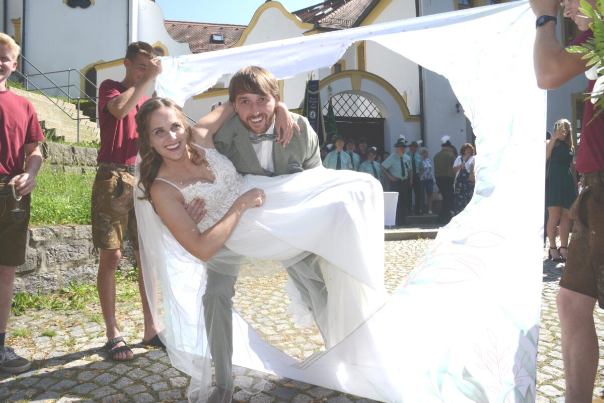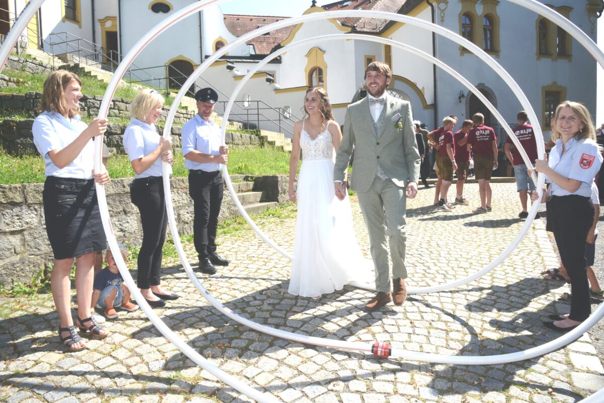Nach dem Gottesdienst zeigten die Hochzeitsgäste und die Gemeinschaft ihre Verbundenheit und Freude. Der Musikverein Waidhaus erfreute mit Marschmusik, während die Feuerwehr Neudorf das Brautpaar mit einer Schlauchspirale und dem Löschen eines “brennenden” Häuschens willkommen hieß. Kreative Gratulationen kamen auch von der Katholischen Jugend Neudorf und den Schützenvereinen Grenzland Waldheim sowie „Enzian“ Frankenreuth. Das frisch vermählte Paar setzte sich anschließend in ein Cabrio und fuhr in Richtung ihrer Hochzeitsfeier in Vohenstrauß, gefolgt von einem Feuerwehrfahrzeug, was die festliche Stimmung unterstrich.