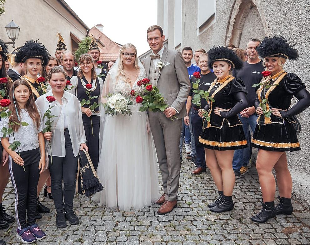 Gemeinsam mit den Fußballern standen auch Mitglieder des Faschingsvereins Pressath Spalier und begrüßten ihrerseits das Paar mit Faschingsgesängen. Nach dem kirchlichen Segen und dem anschließenden Glückwunschreigen feierte das frisch getraute Paar mit seinen Gästen im Alten Sägewerk in Trabitz. Die standesamtliche Trauung fand bereits am 8. August statt.