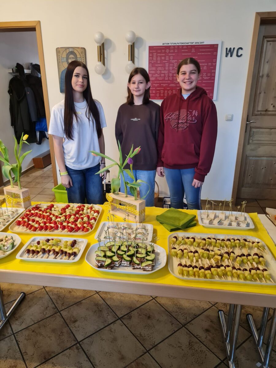 In der Mittagspause sorgte das Küchenteam um Alexandra Friedl für ein köstliches Mittagessen. Obst, Gemüse, Getränke und Snacks wurden zusätzlich gereicht. Danach ging es weiter mit den Workshops. Für den Nachmittag hatte ein Workshop unterschiedlichste Fingerfood und Party-Häppchen vorbereitet. Nachdem sich alle gestärkt hatten, wurde das Einstudierte aus den Workshops Theater und Shuffle-Dance aufgeführt.