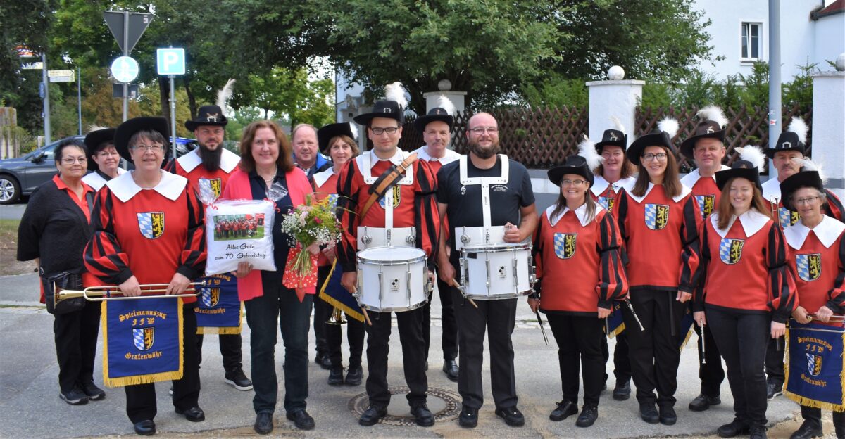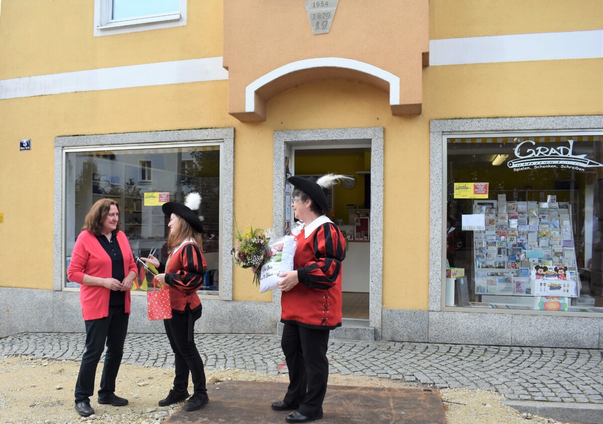 Zuvor gab es ein nachträgliches Geburtstagsständchen zu Petras 70. Geburtstag. Im Namen aller gratulierte die Leiterin des Spielmannszuges Isabelle Moeller. Als Geburtstagsgeschenk gab es Blumen und ein Kissen, auf dem der Spielmannszug abgebildet war. Zur Ladenschließung wurde ein Schlüssel überreicht, der von Bäckermeister Florian Pappenberger gebacken wurde.