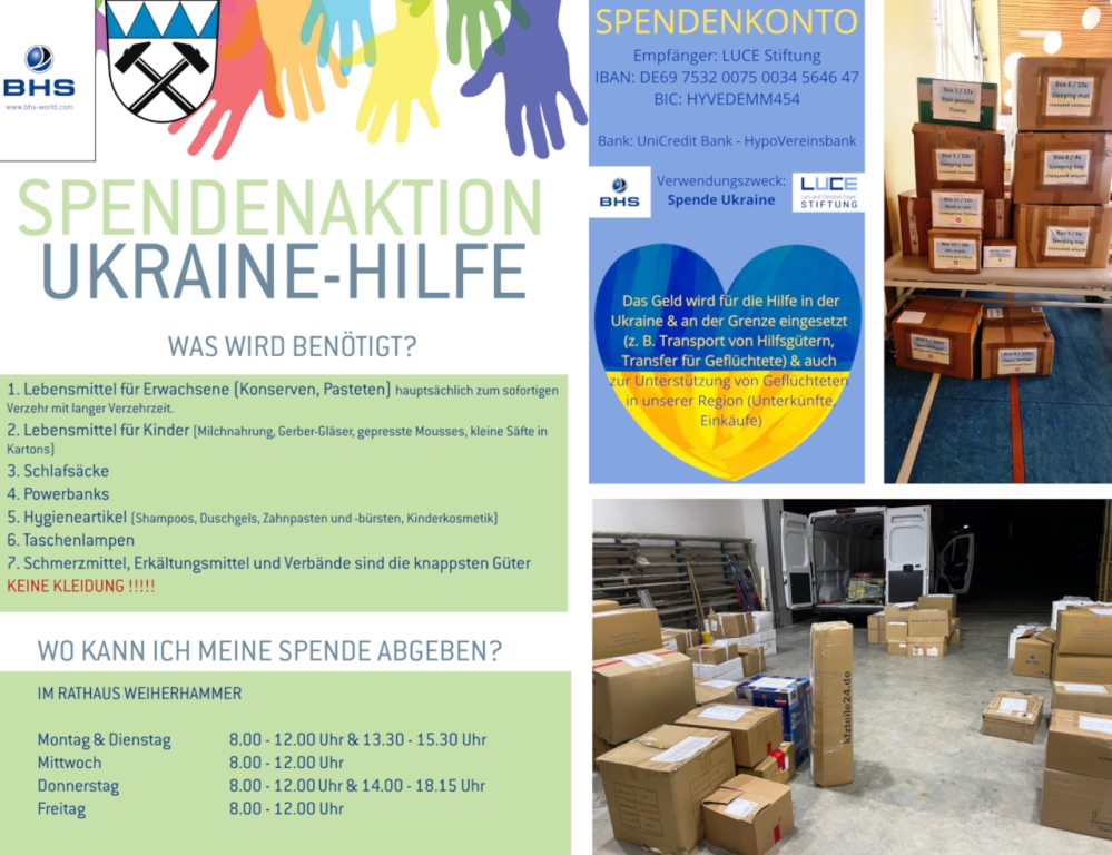 Wer die BHS- und LUCE-Hilfsaktion unterstützen möchte, kann sich mit Spenden, egal ob materiell oder monetär, einbringen. Vor allem Unterkünfte und Wohnungen, in denen Geflüchtete unterkommen können, werden gesucht. Bei Fragen kann man sich an das gemeinsame Orga-Team wenden: Telefon: (09605) 919-0, E-Mail: corporatecommunications@bhs-world.com