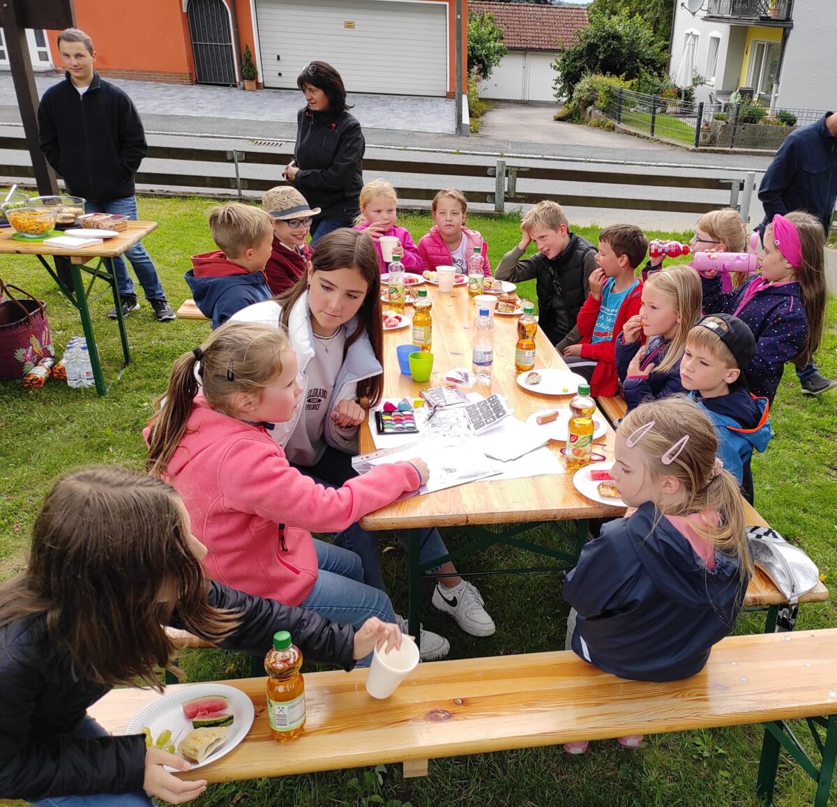 Anschließend ging es dann bei Abenddämmerung zum Freizeitzentrum in die Poststraße und hier ging im wahrsten Sinne des Wortes „die Post ab“. Das Büchereiteam mit Maria Pleyer, Roswitha Schenk, Carola Käs, Niklas Bergler, Lorenz und Marlene Greiner gestalteten ein gesundes Picknick mit Melonen, Käse und auch Brezn. Süßigkeiten wurden genussvoll verzehrt, Spiele gespielt und auch die Gerätschaften an der Freizeitanlage gerne genutzt.