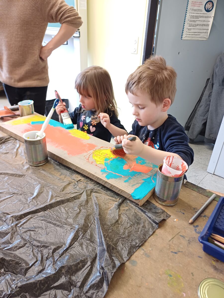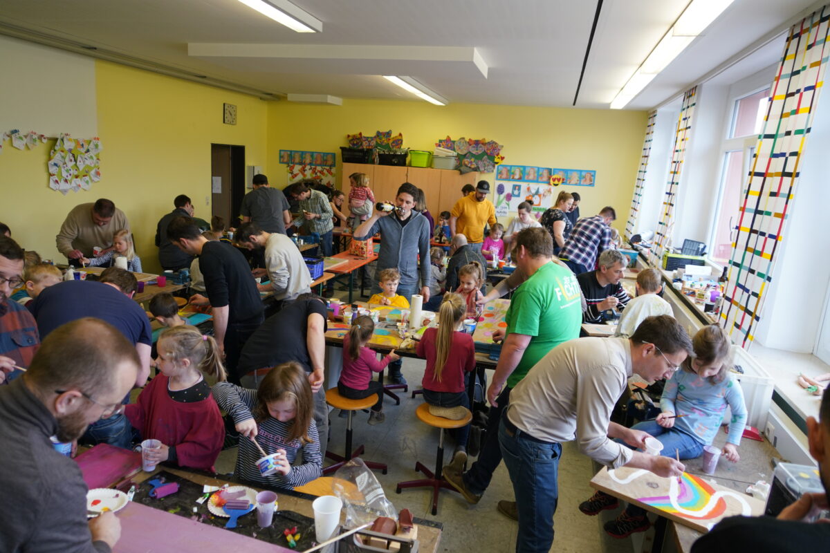 Die Erwachsenen wollten sich vor ihren Kleinen auf keinen Fall eine Blöße geben. Manche Kinder hatten sogar einen Malerkittel um und vereinzelt arbeiteten sie direkt auf dem Tisch, um den „Überblick“ über das Kunstwerk nicht zu verlieren.