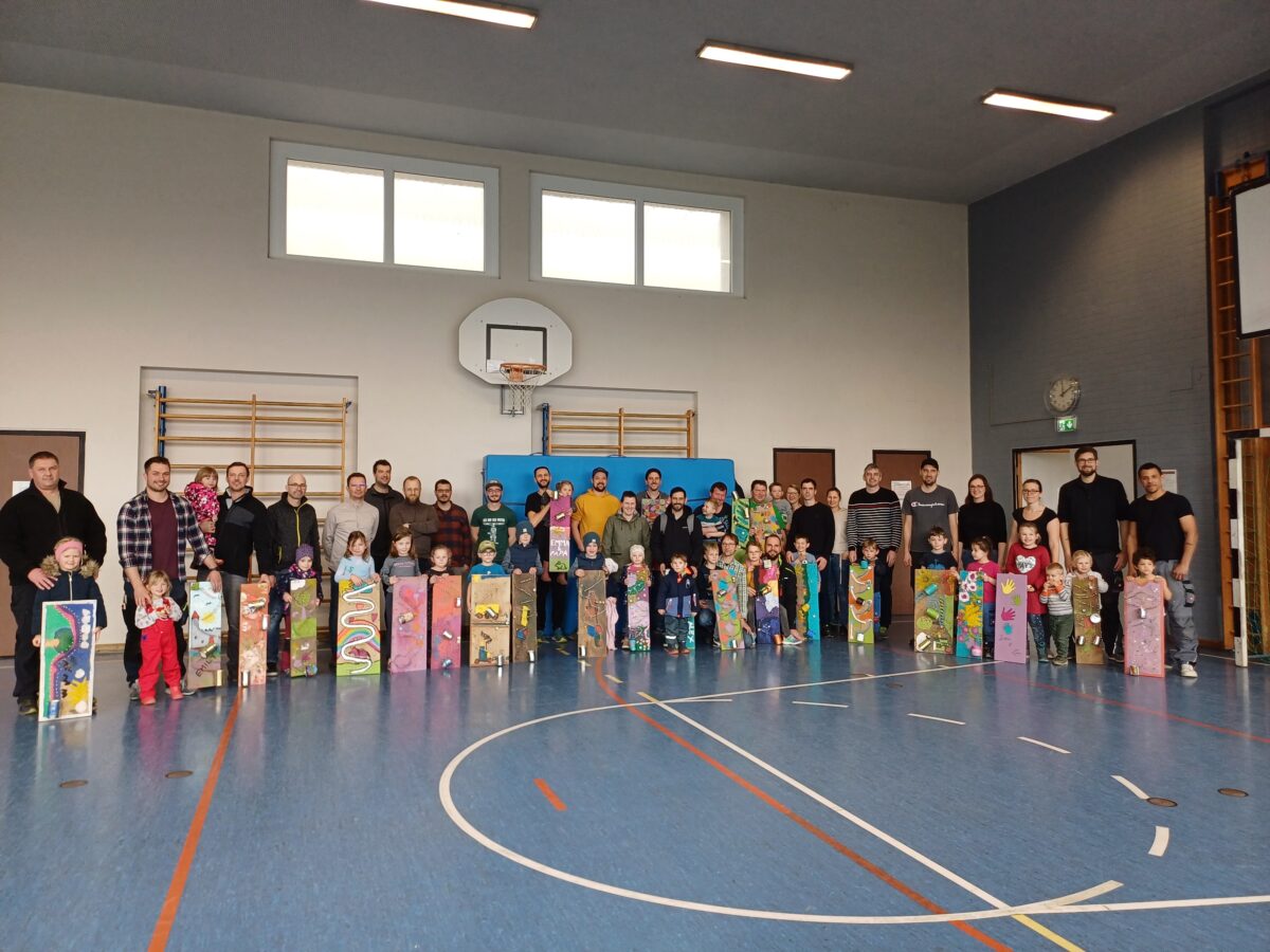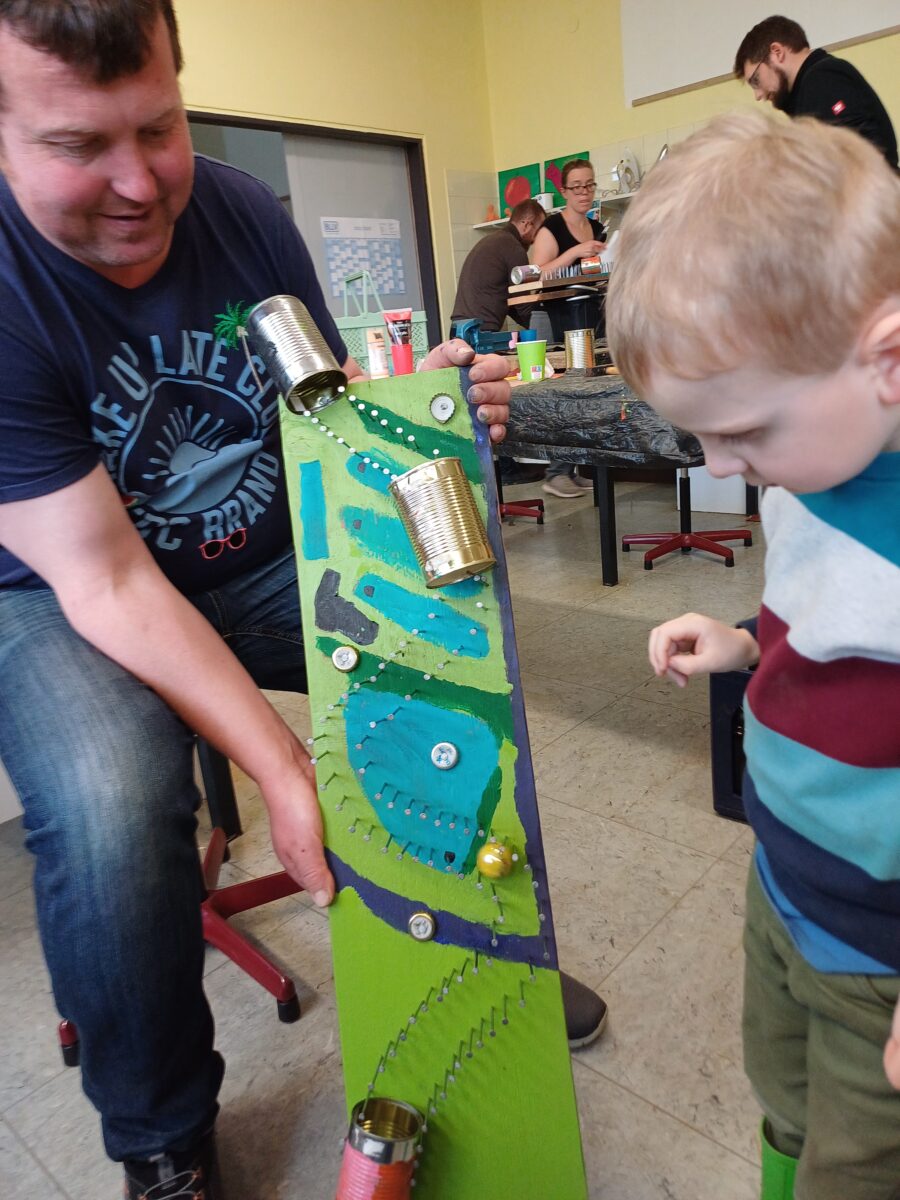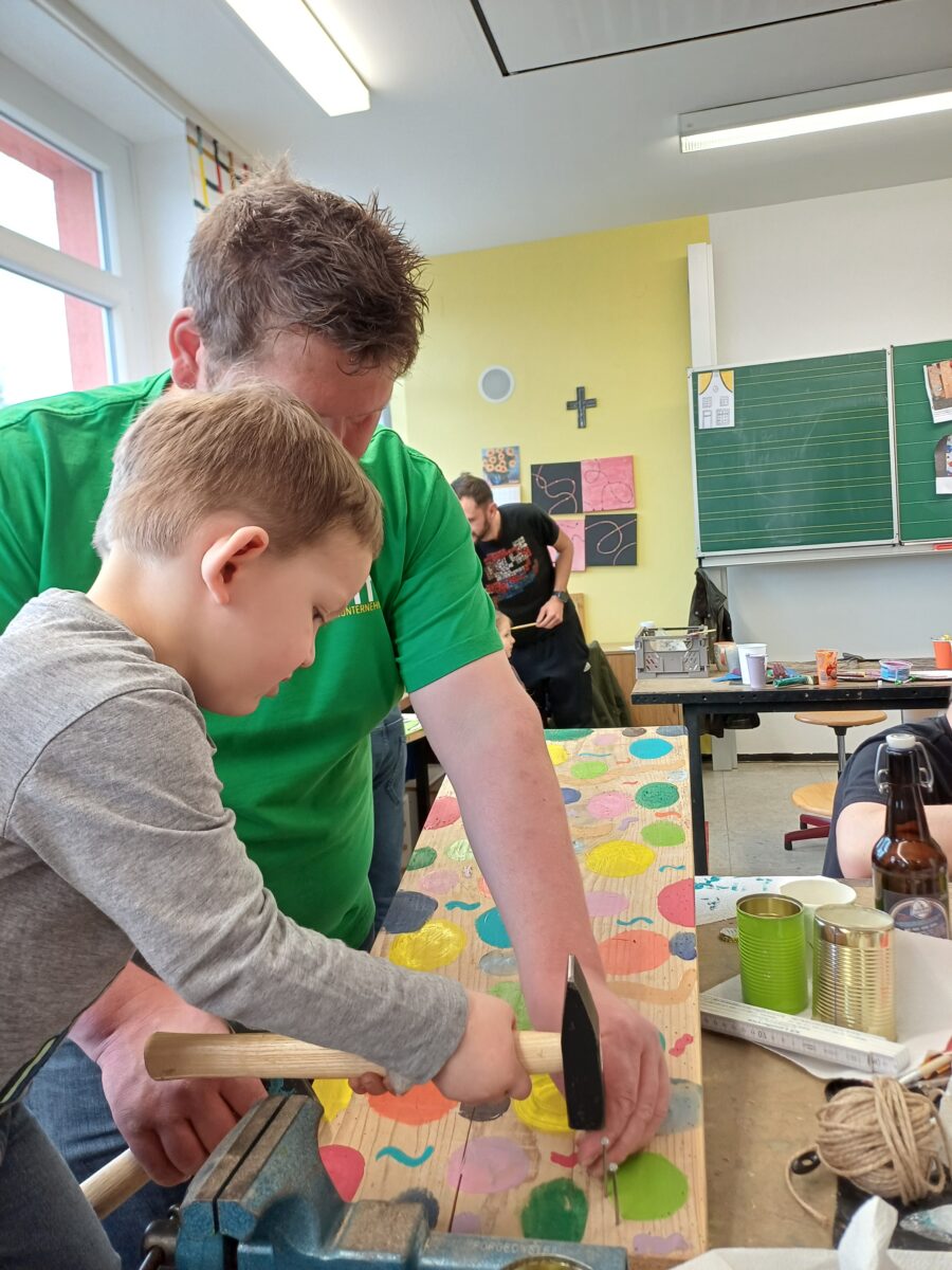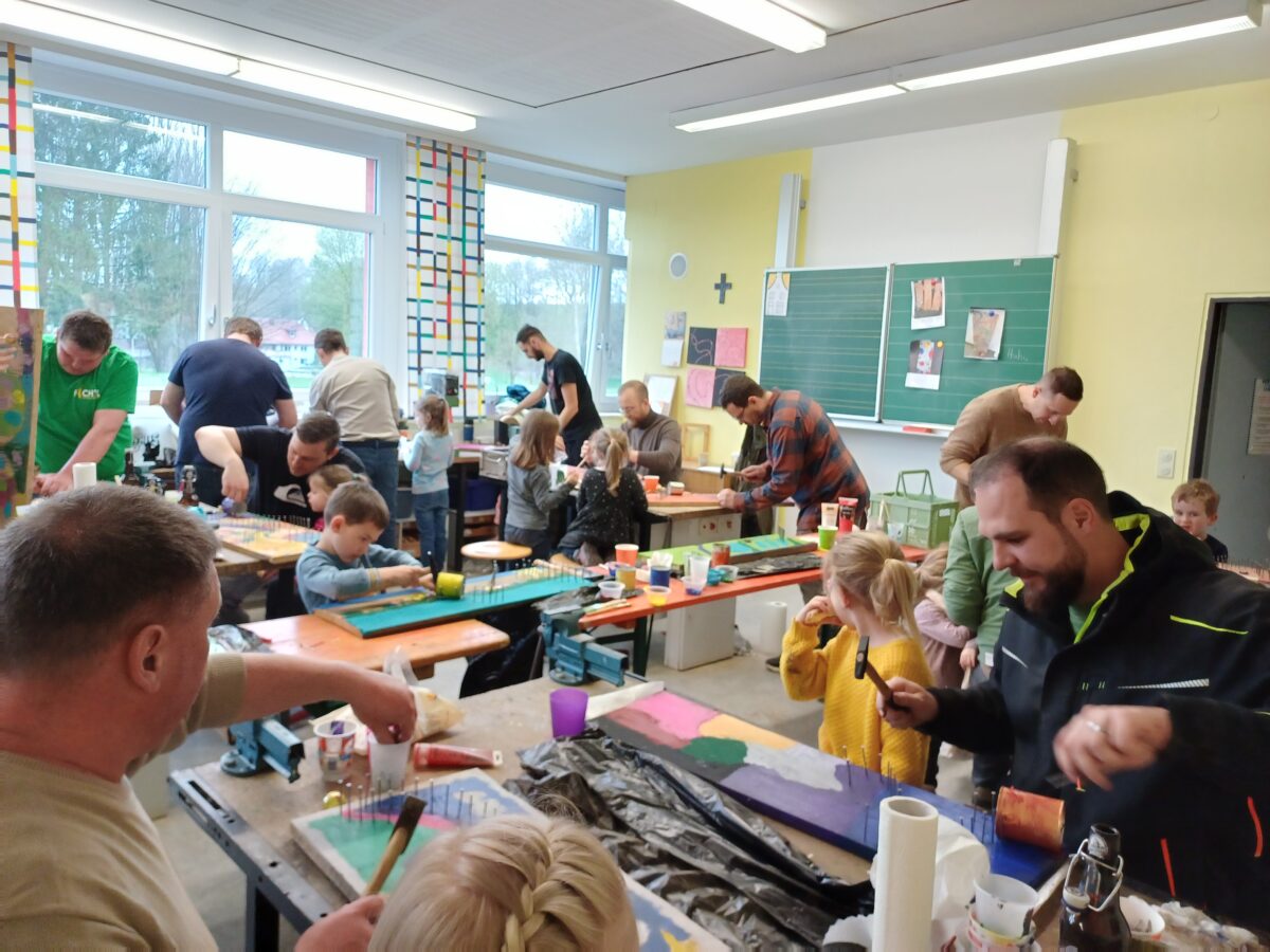 Leider konnte man die Aktionen nicht im Freien durchführen, Carina Hartwig, die Rektorin der Grundschule hatte kurzerhand den Werkraum geöffnet und so konnte man dort eine „Kugel- Murmelbahn“ kreieren. Hoch konzentriert waren die Kleinen aber auch die vielen Papis am Arbeiten, sie schleiften, malten und hämmerten, was das Zeug hielt.