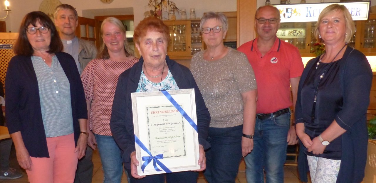 Die Laudatio dazu hielt Winter: Woppmann ist 1984 dem Zweigverein beigetreten, ab 1993 hat sie vier Jahre das Schriftführerinnenamt ausgeübt und 1997 wurde sie zur ersten Vorsitzenden gewählt. “So war sie 22 Jahre an der Spitze und hat fast Unmögliches möglich gemacht.” Sie hat Pfarrfeste in Leuchtenberg, Hoffeste in Steinach, die Kulturtage einst in Wieselrieth, die Burgweihnachten, das Kräuterbüschelbinden, die Muttertagstreffen, die Ausflüge, die Dekanatsversammlungen, die Kaffeestube auf der Burg, das Fastenessen und vieles mehr organisiert und durchgeführt. Besonders ihre Schwammerlbrühe, die bereits über den Landkreis hinaus bekannt ist, zubereitet.