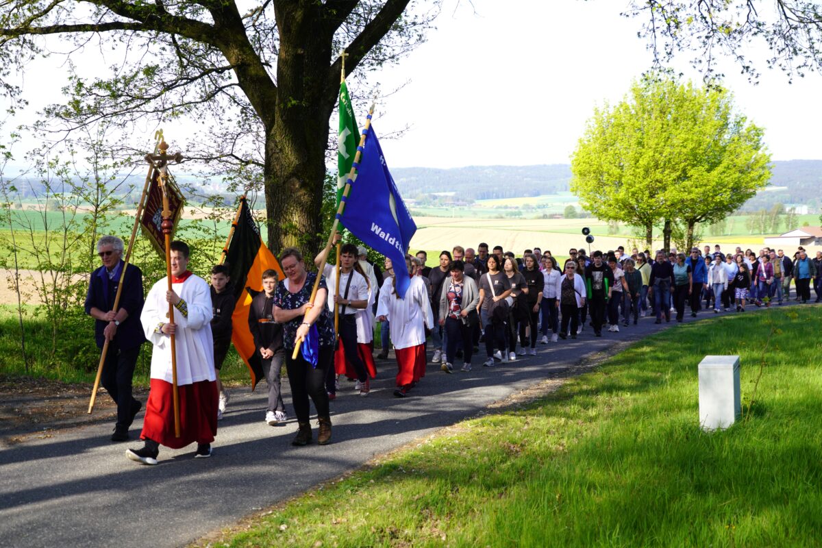 Manche waren schon am frühen Morgen aufgebrochen und marschierten aus umliegenden Orten zum offiziellen Start an der Pfarrkirche in Waldthurn. Betend und singend führte der Waldthurner Pfarrer Norbert Götz die Prozession von Waldthurn aus, wobei Fahnenabordnungen der KLJB, Kolping, MMC und Frauenbund die Prozession begleiteten, an.