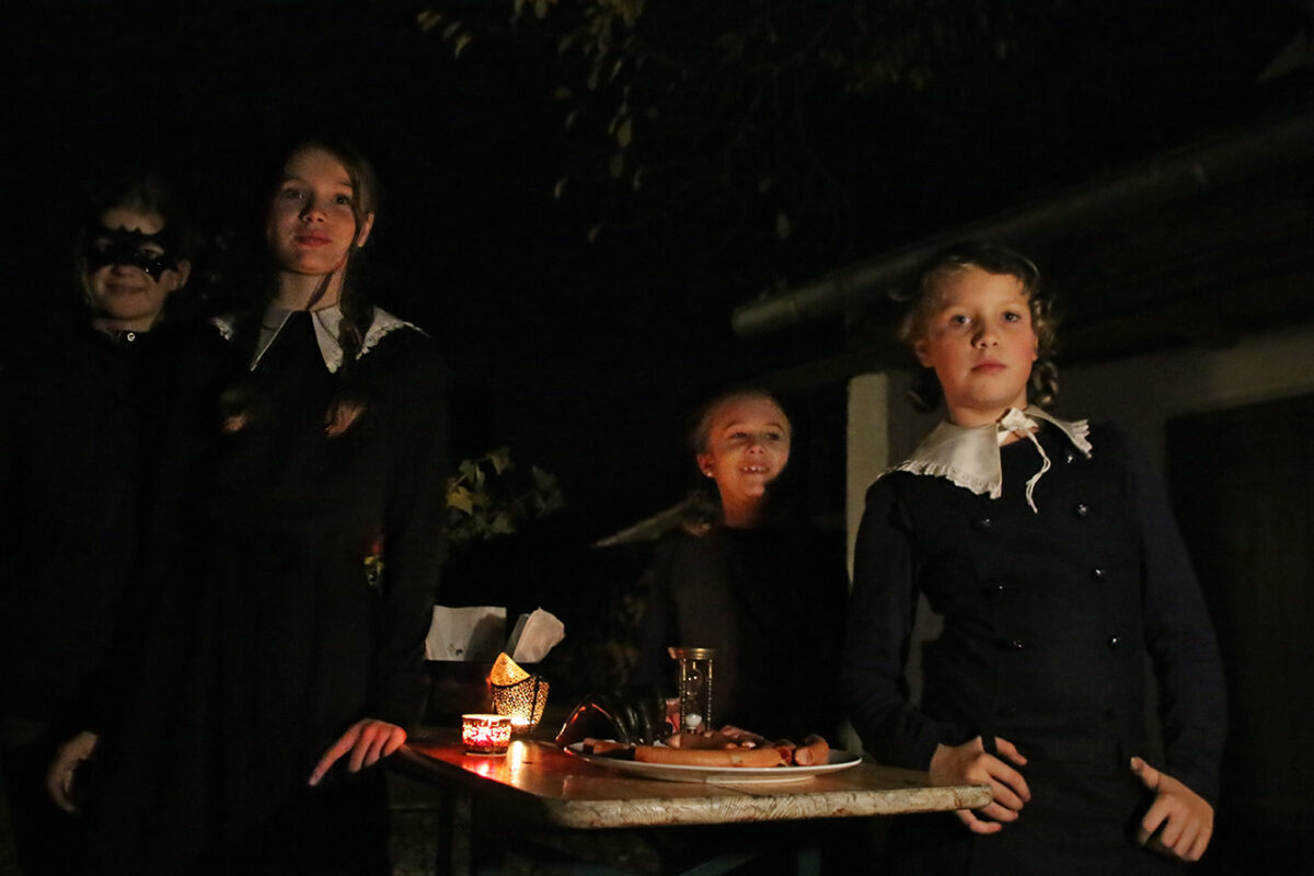 „Ich gehe als Wednesday“, sagt unsere 9-Jährige. „Ich auch“, besteht die 11-Jährige mit in die Hüften gestemmten Händen. Gesagt, getan. Die zwei Mädchen sehen in ihren schwarzen Kleidern mit weißer Halskrause, dunklen Haaren um die bleichen Gesichter, dem Vorbild zum Verwechseln ähnlich. Es sollten an diesem Halloween-Abend noch diverse Wednesdays durch Dorf strömern und mit ernsten Gesichtern Tribut einfordern.