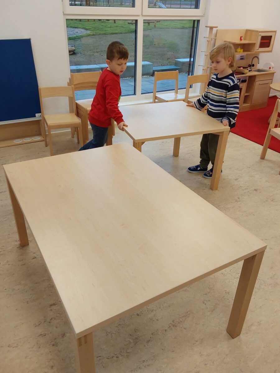 Daraufhin wurden gemeinsam überlegt, geplant und schlussendlich Möbel und Tische gerückt. Den Kindern war es auch wichtig, dass es für alle Kinder einen Sitzplatz gibt, daneben sollte es schön aussehen und die Spielmaterialien dürfen nicht weit weg sein.