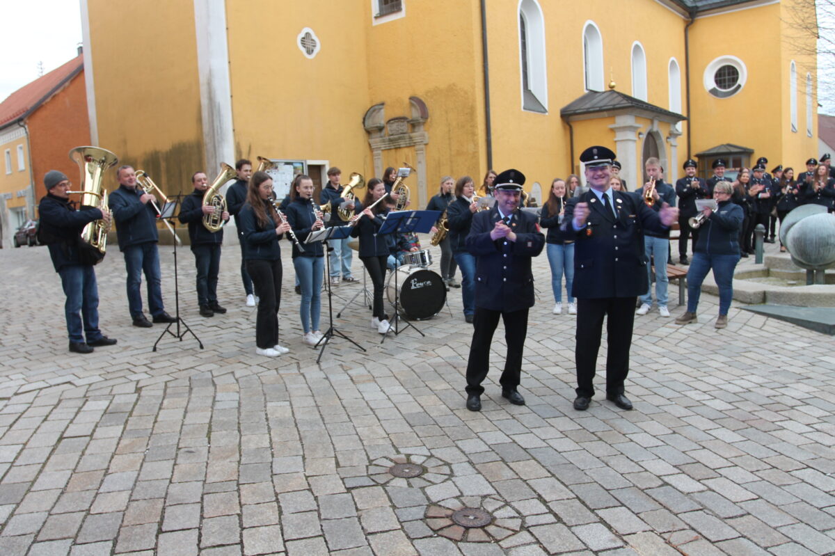 Mit dem eigenen Auto oder gar zu Fuß mussten die beiden nicht zum Rathaus kommen. „Die holen wir schon von zu Hause ab“, hatten die Kameraden ausgemacht und natürlich Wort gehalten. Mit einem lautstarken „Tatütata“ bogen sie mit dem Löschfahrzeug in die Schulstraße in Richtung Rathaus ein. Die Überraschung für Schwarz und Müller war perfekt, als sie das Vereinsorchester des Musikvereins Waidhaus mit Hermann Mack an der Spitze musikalisch empfing.
