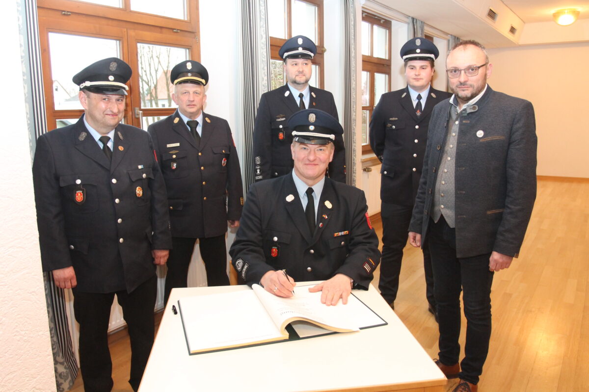 Den neuen Kommandanten Johann Dierl und Maximilian Fuchs galten die besten Wünsche für eine weiter erfolgreiche Arbeit. Schwarz war in diesem Zusammenhang sicher: „Die Feuerwehr ist in besten Händen.“ Eine weitere Überraschung für Schwarz und Müller hatte der Bürgermeister mit dem Eintrag in das Goldene Buch parat. In diesem durften sich alle Teilnehmer an der Feierstunde, unter ihnen neben den weiteren Bürgermeistern Josef Schmucker und Ewald Zetzl, mehreren Marktgemeinderatsmitgliedern und Kreisbrandinspektor Martin Weig, verewigen.