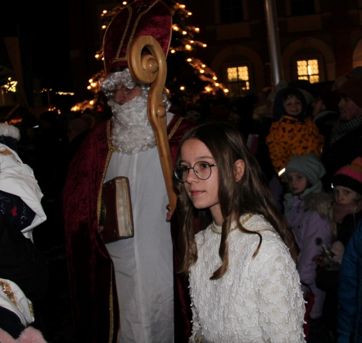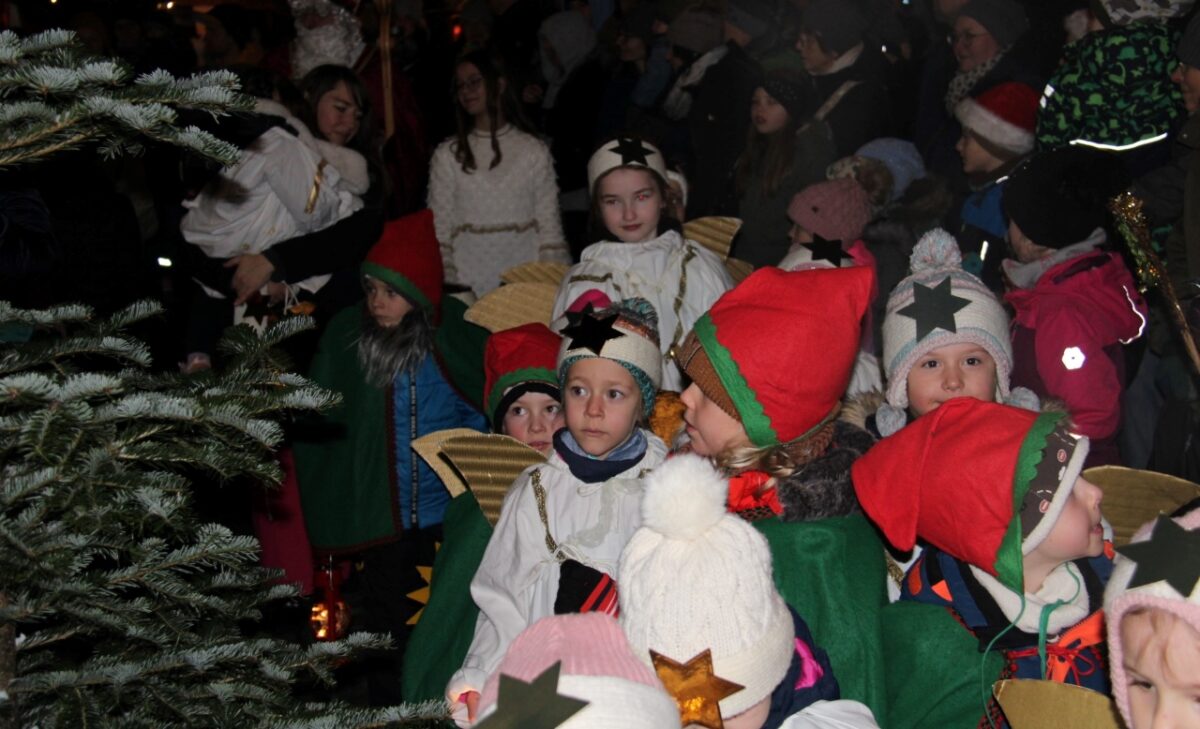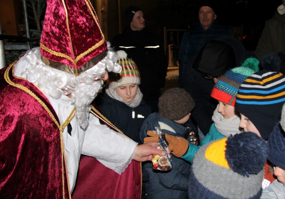 Kurz nach 17 Uhr hatte das Warten für die Kinder ein Ende: Der Heilige Nikolaus drehte seine Runde durch die dicht gedrängt stehenden Besucher. So bekam jedes Kind ein Säckchen geschenkt. Dann verkündete er von der Bühne allen Kindern und Kind gebliebenen seine Botschaft von der Vorfreude auf Weihnachten und Frieden. Das Christkind, das von Paula Scherb gespielt wurde, und viele Zwerge begleiten den von Wolfgang Meidenbauer verkörperten Heiligen.