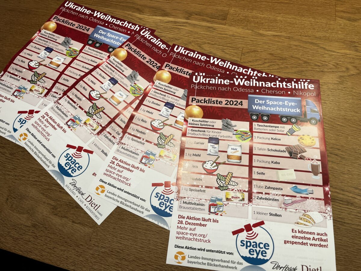 Space Eye braucht noch viele Spenden für den Weihnachtstruck, der am 13./14. Dezember in die Ukraine startet. Willkommen sind Kuscheltiere, kleine Spielsachen, Malbücher, Farbstifte, Taschenlampen, Multivitamin-Brausetabletten, Mehl, Zucker, Reis, Nudeln, Speisefett, Zahnbürsten, Zahnpasta, Schokolade, Kekse, Kakao, kleine Stollen und Seife.