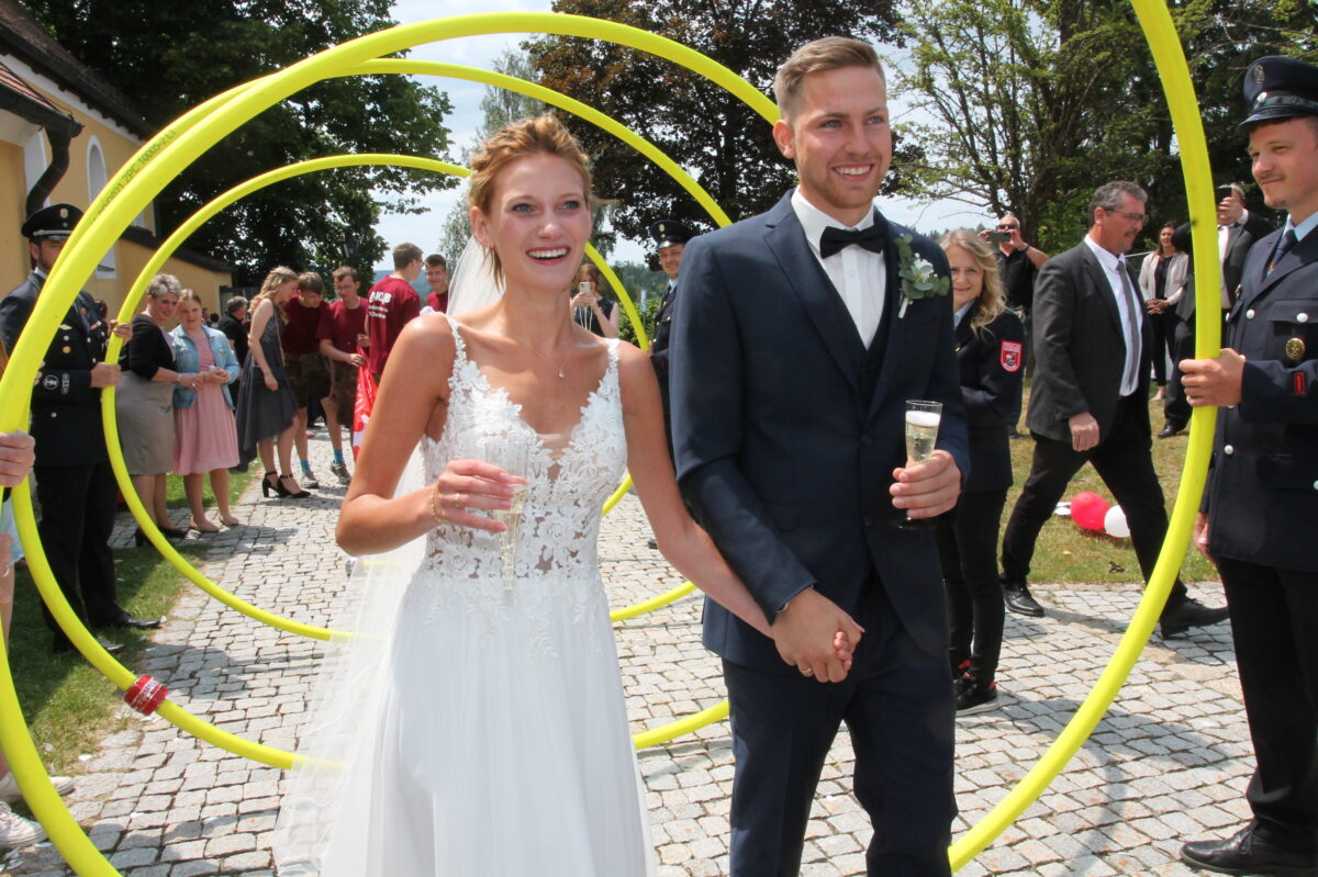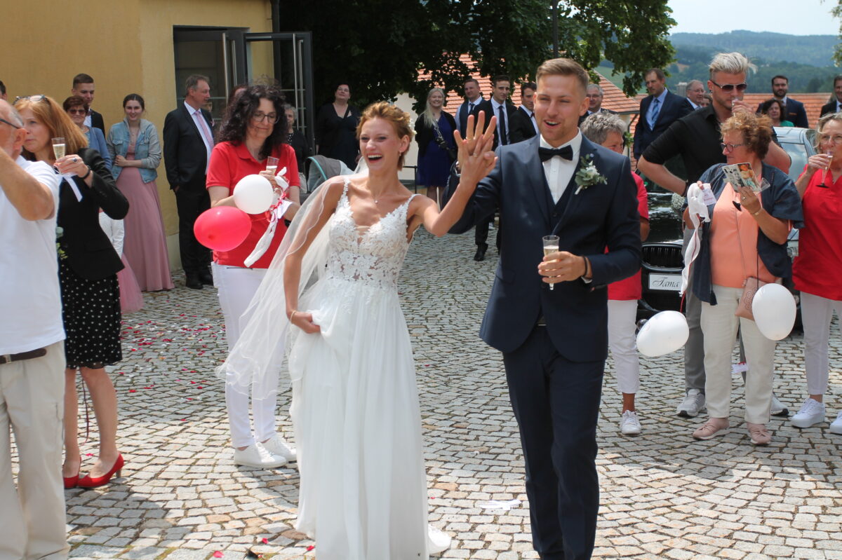 „Heute krönt ihr eure Liebe für ewig“, wies der Pfarrer hin. „Der Gott der Liebe hat euch diese Liebe geschenkt und anvertraut, dass ihr sie miteinander konkret und erfahrbar werden lasst.“ Mit Pauken und Trompeten ließ am Kirchplatz der Musikverein Waidhaus die Frischvermählten hochleben und forderte sie auf, gemeinsam den Taktstock zu schwingen.