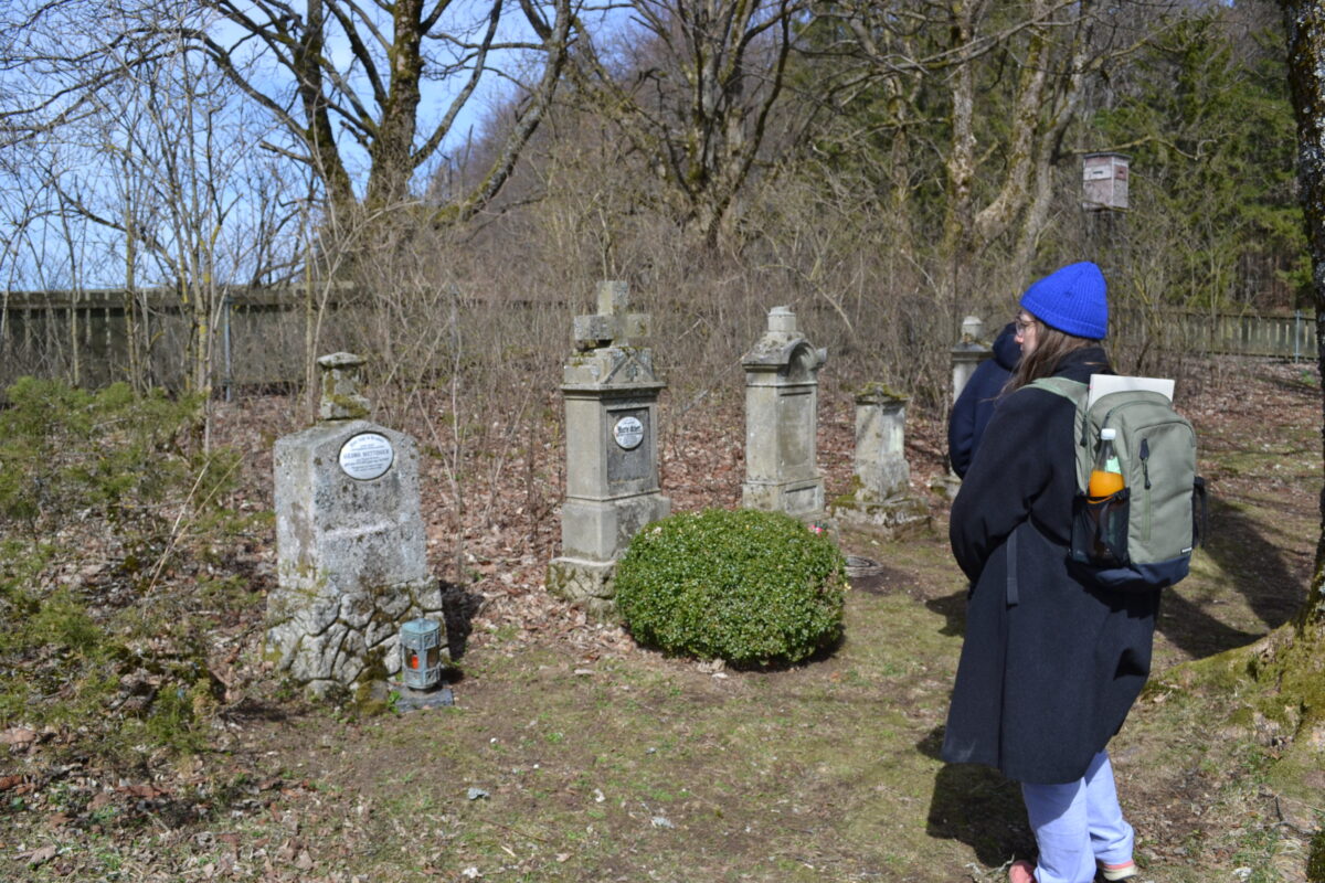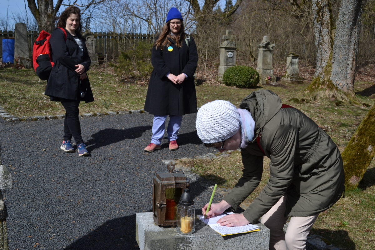 Wie viele ihrer Kolleginnen und Kollegen steht Katerina Vanova, die in Regensburg lebende tschechische Künstlerin, still und ehrfürchtig vor den Gräbern auf dem Friedhof von Paulusbrunn, dem einzigen Überbleibsel der vor dem Krieg fast 1500 meist deutschstämmige Einwohner zählenden Ortschaft. “Hier ruht unsere gute Mutter. Marie Eckert, gest. am 27. Januar 1929 im 52. Lebensjahr” steht auf dem Emailleschild an dem noch erstaunlich gut erhaltenen Grabstein. Sie ist wohl eines natürlichen Todes gestorben, kann man annehmen. Dass dies nicht bei allen hier Begrabenen der Fall ist, davon kann Rainer Christoph erzählen.