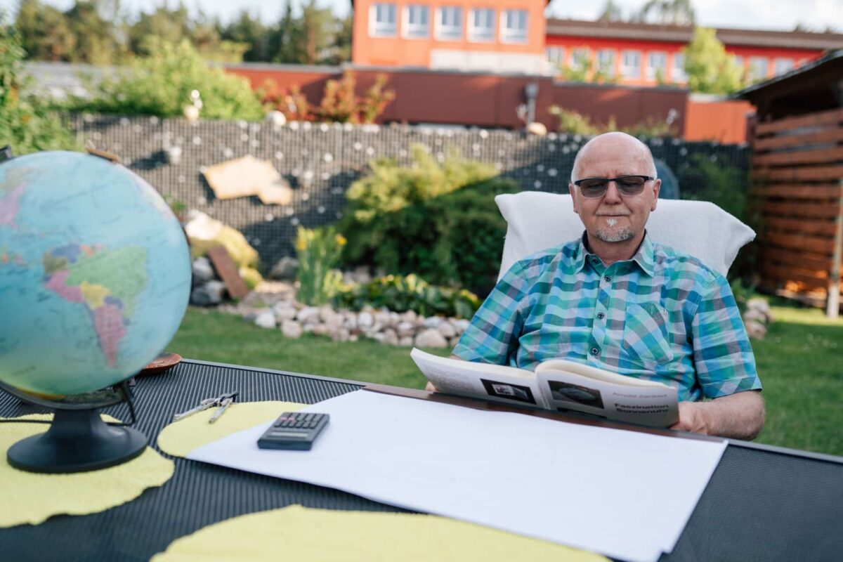 Auf seiner sonnen geküssten Terrasse versuchte er anfangs, mit einem Kugelschreiber Sonnenuhr-Linien zu zeichnen, was gänzlich misslang. Zunächst überfordert, dann durch das Buch „Faszination Sonnenuhr“ auf die richtige Bahn gelenkt, klappte es immer besser. Erste Papiermodelle entstanden, immer aufregend motiviert, ob die berechneten Formeln denn stimmen und die gebaute Sonnenuhr funktionieren würde.