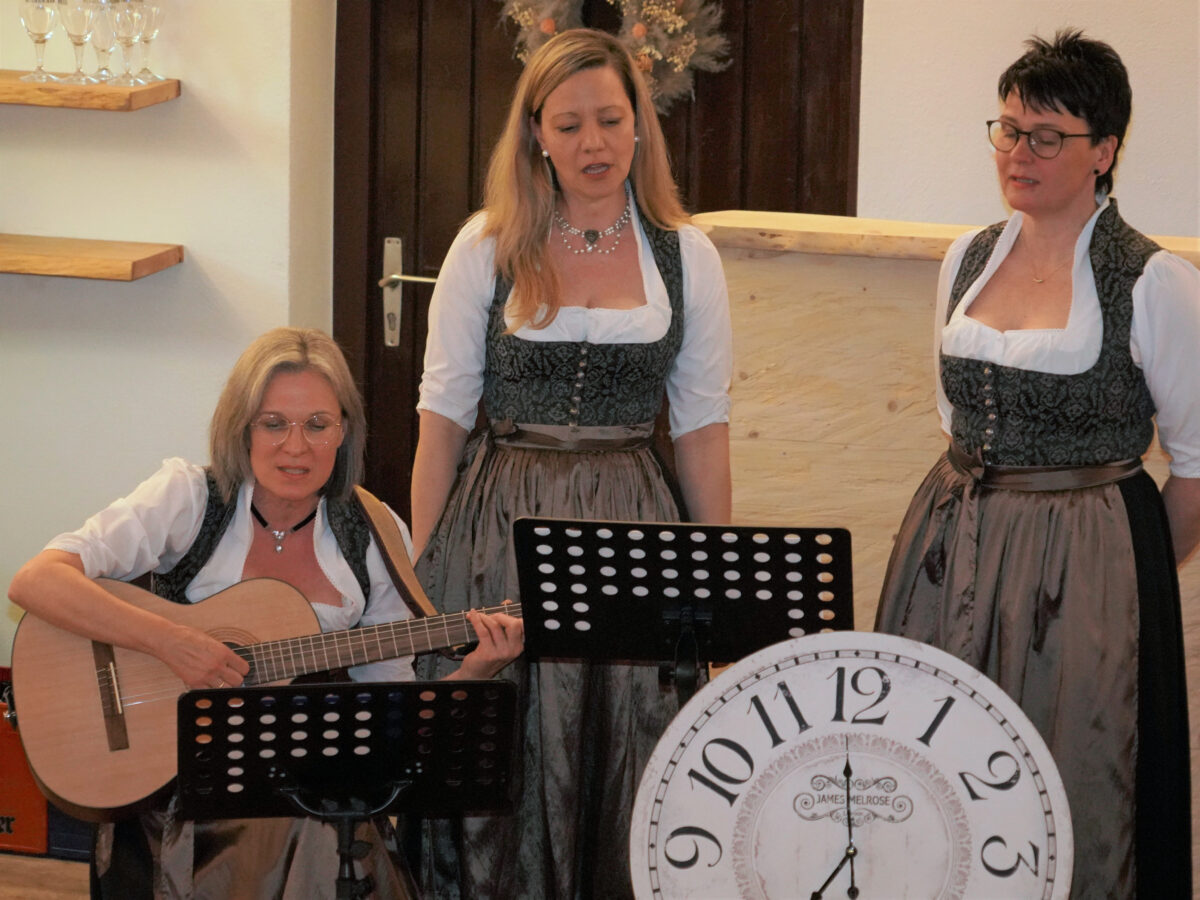 Themenbezogene Lieder wie „Wie spät ist es auf der Wirtshausuhr“ sangen Doris Völkl, Andrea Götz und Steffi Daubenmerkl kurz: TriAngel bei der Buchvorstellung.