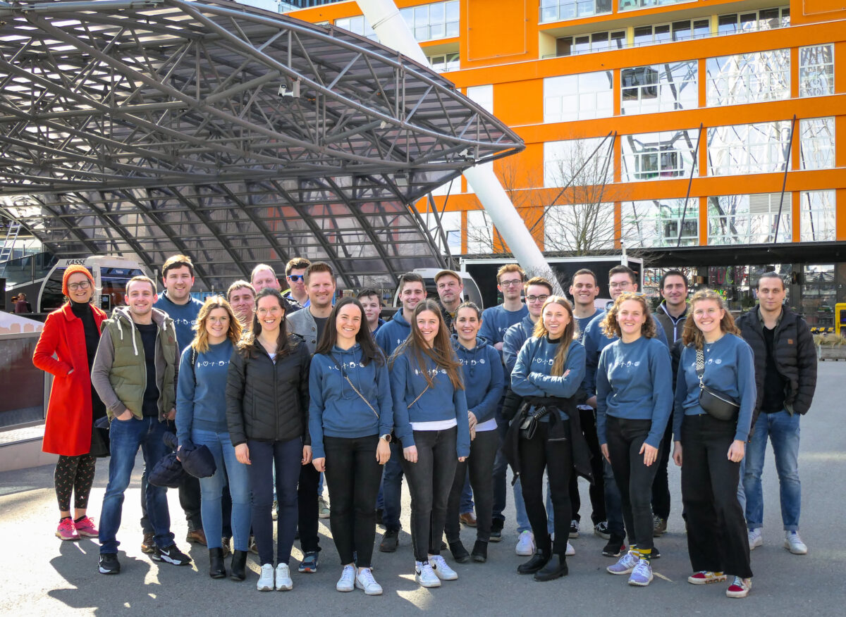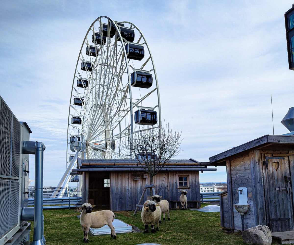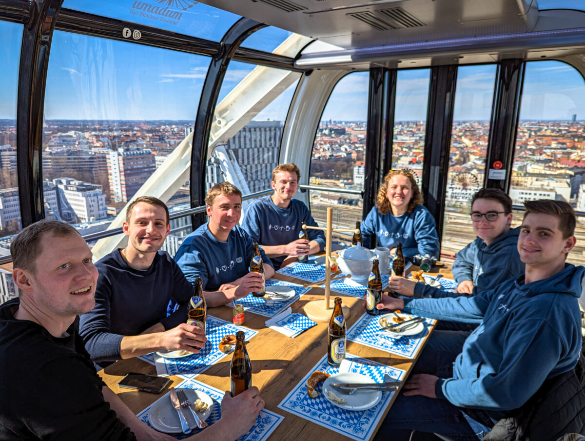 Zur Mittagszeit folgte ein traditionelles Weißwurst-Frühstück samt Hefeweizen – jedoch auf 80 Metern Höhe. Das Riesenrad inmitten des Viertels bat bei bestem Wetter einen wundervollen Blick auf die Stadt München bis zu den Alpen. Nach kurzem Verweilen auf den großen Plätzen bei Kaffee oder Bier ging es zur Brauereiführung im Werksviertel-Bräu.