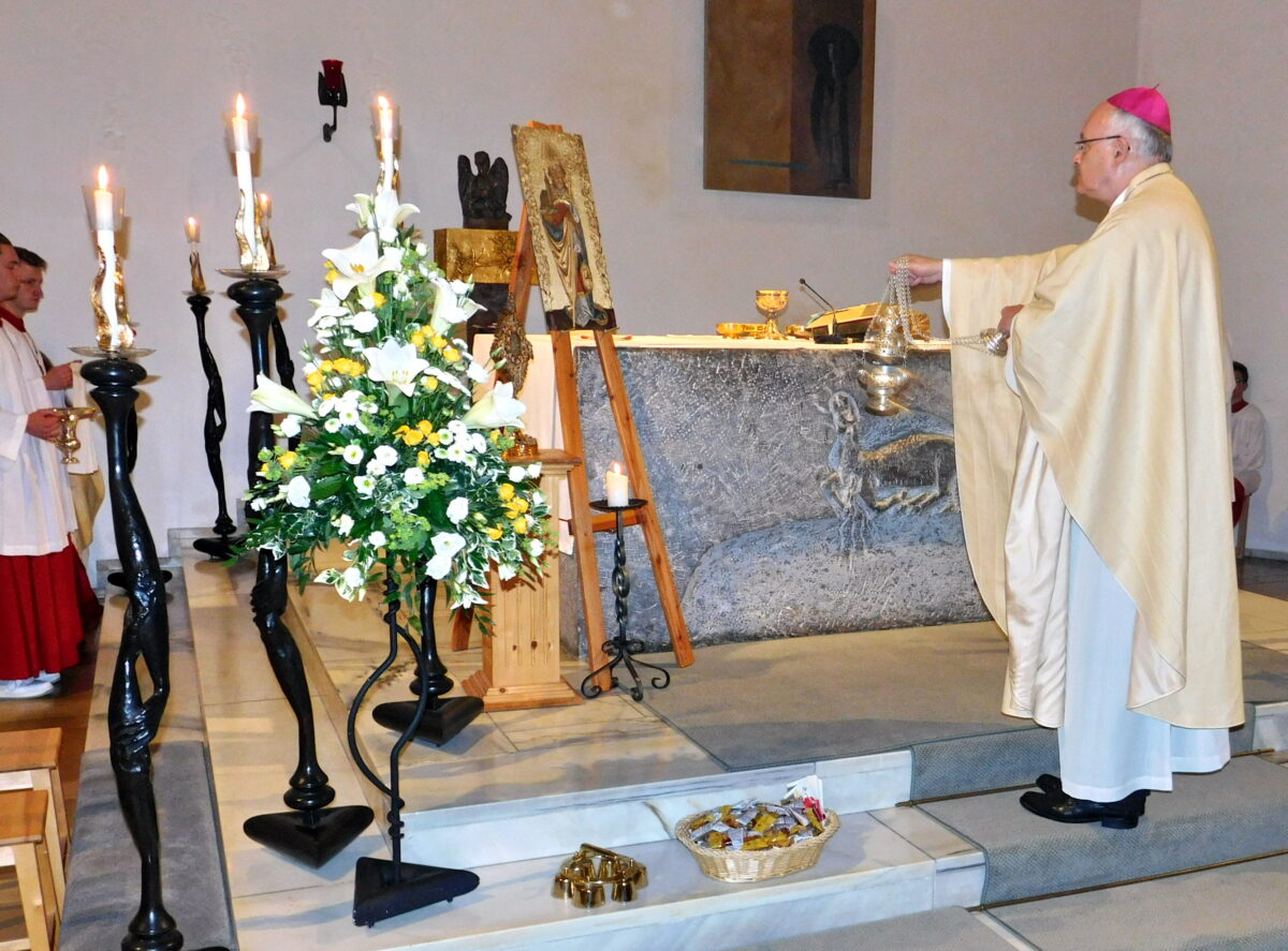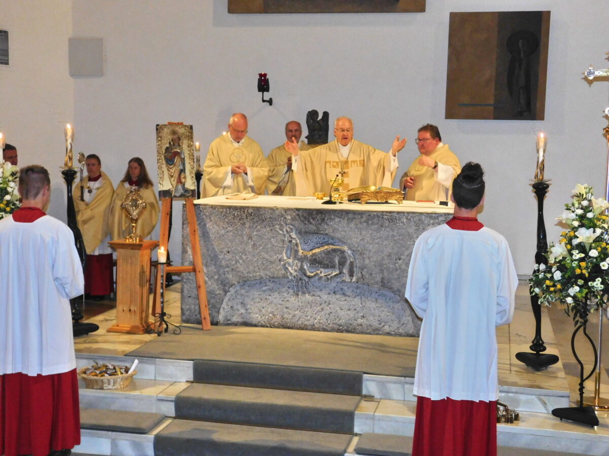 Zum Gedenktag des Heiligen Josef im Marienmonat am 31. Mai war der Nachfolger des Heiligen Wolfgang auf dessen Bischofsstuhl, Diözesanbischof Dr. Rudolf Voderholzer, höchstpersönlich als Hauptzelebrant und Festprediger der Einladung von Pfarrer Sven Grillmeier in die Pfarreiengemeinschaft gefolgt. Bischof Voderholzer hatte dann nebst seiner Festpredigt über den Heiligen Wolfgang als “Vater seiner Priester” auch eigens eine Wolfgangsreliquie mitgebracht. Flankiert von einem Wolfgangsbild und einer Kerze bildete sie zum einen das Herzstück des Altars und des Festgottesdienstes. Zum anderen nutzten alle Gläubigen am Ende des Gottesdienstes die Gelegenheit, sich vom Bischof mit der Wolfgangsreliquie den Einzelsegen erteilen zu lassen.