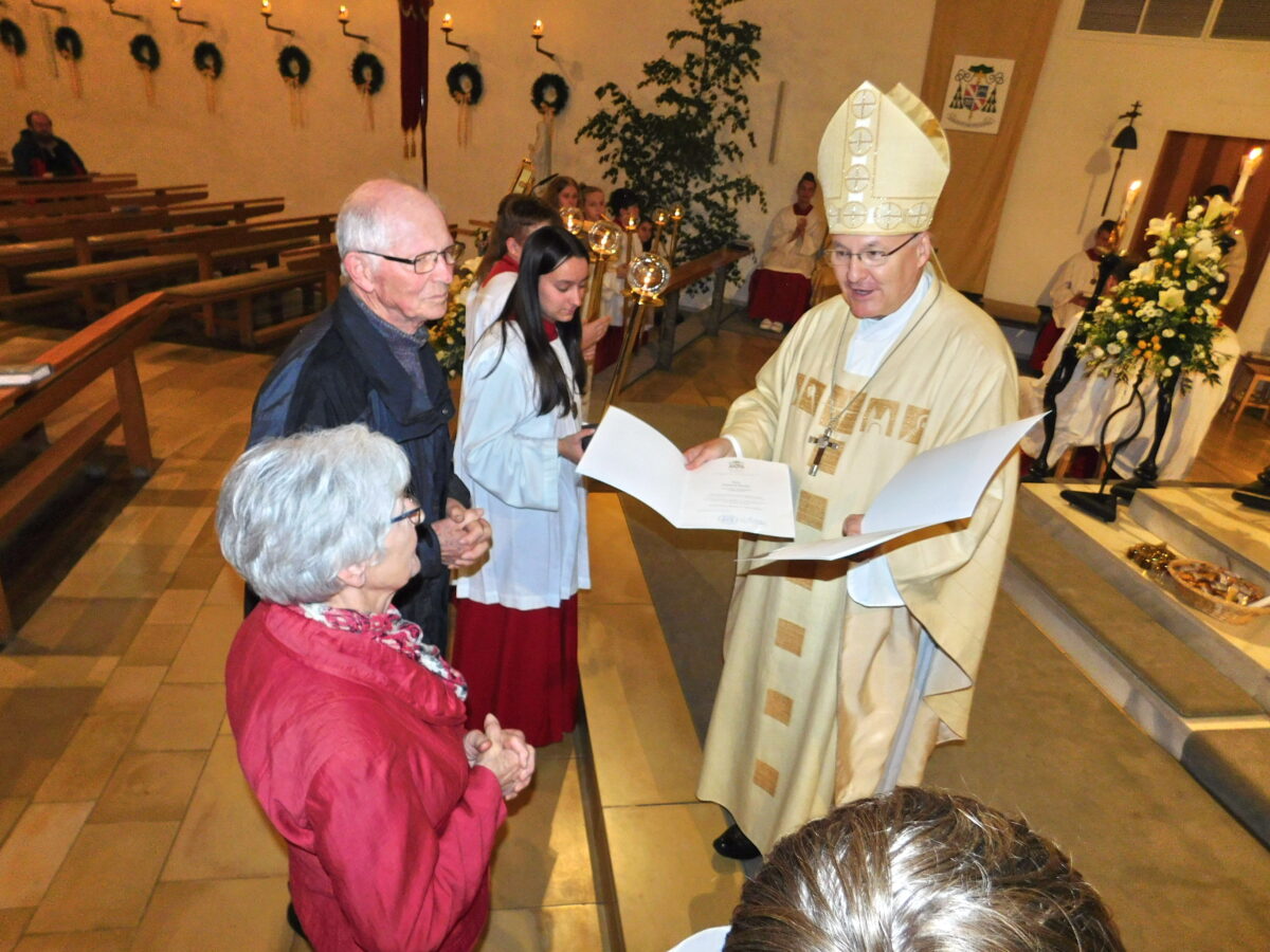 Die besondere Verehrung dieses Patrons von Bistum und Stadt Regensburg in der Dreifaltigkeitsgemeinde zog sich wie ein roter Faden durch die Botschaft, das Gebet, den Gesang sowie die Zeremonie eines in vielerlei Hinsicht bemerkenswerten Festgottesdienstes. Die Diözese feiert vom 31. Oktober 2023 bis zum 31. Oktober 2024 ein Jahr des Heiligen Wolfgang, um an die 1100-jährige Wiederkehr seines Geburtstages zu erinnern.