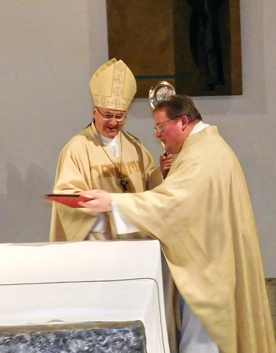 Als Dankeschön überraschte Grillmeier am Ende seinen Oberhirten dann auch mit einer Palla (Messkelchdeckel) mit gestickten Attributsmotiven des Heiligen Wolfgang (Kreuz, Kirche und “Wolfgangihackl”), einer ledernen Predigtmappe aus Frankreich und einer Weihnachtskrippe in Zündholzschachtelformat als Erinnerungsgeschenk.