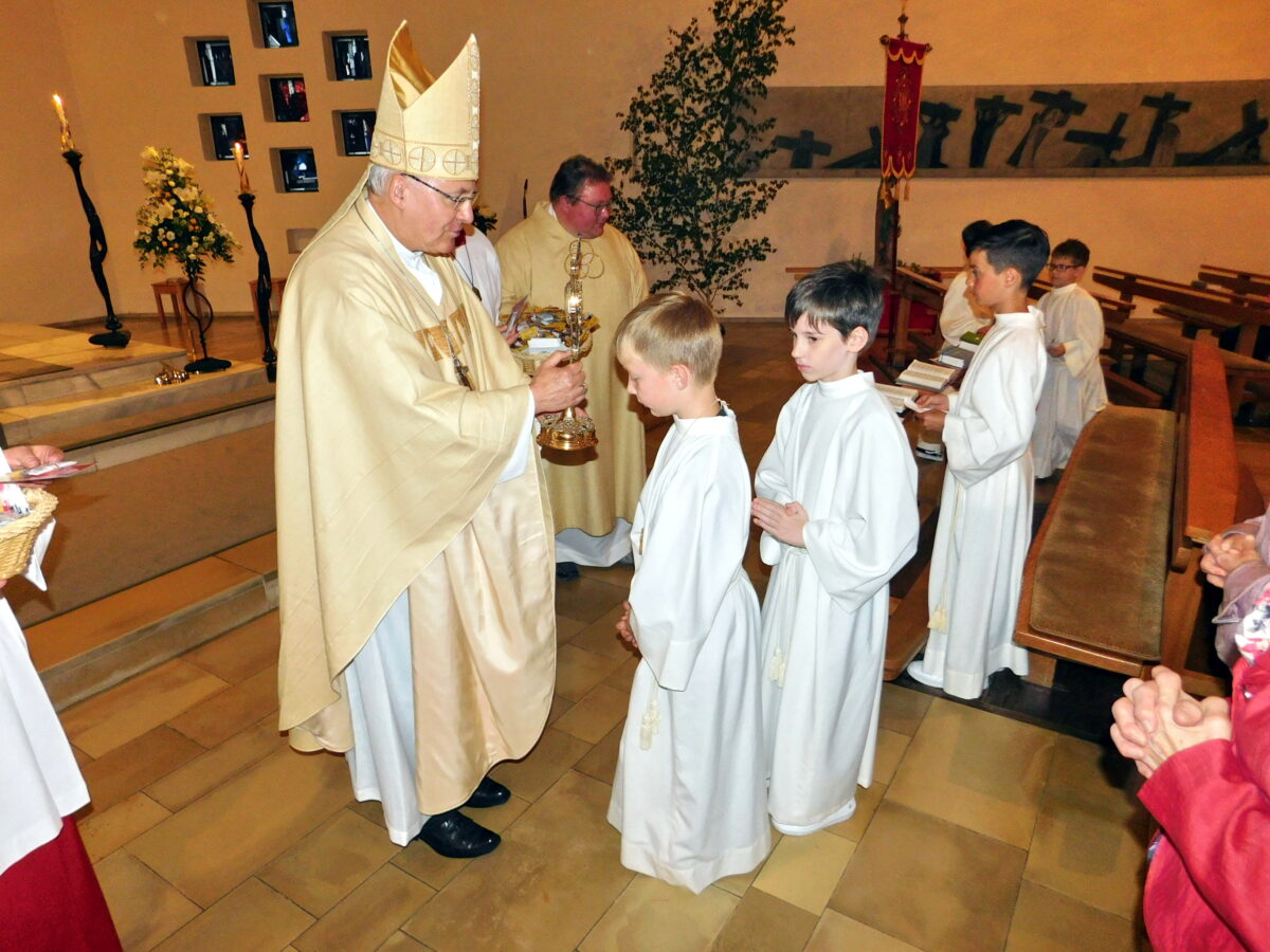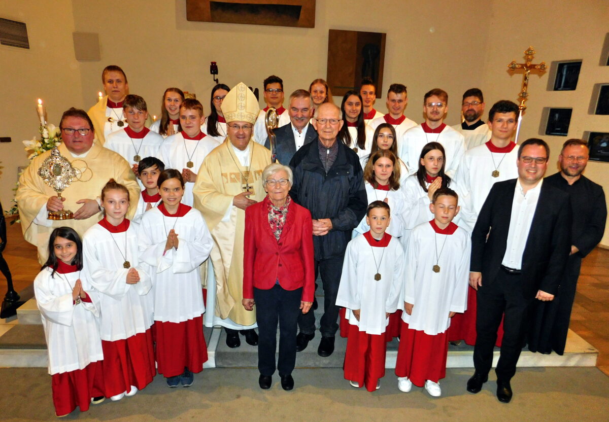Den hohen Gast aus Regensburg sollte eine mit viel Liebe für das Detail vorbereitete feierliche Liturgie erwarten. Dazu hatte Grillmeier Pfarrvikar Damian Prokscha als Konzelebranten und Diakon Franz Lautenbacher, Mehlmeisel, der auch das Evangelium las, als Assistenz am Altar eingeladen. Sie wurden beim Einzug zu den Klängen des “Ecce sacerdos magnus” von Johann Singenberger von 22 Ministranten begleitet.