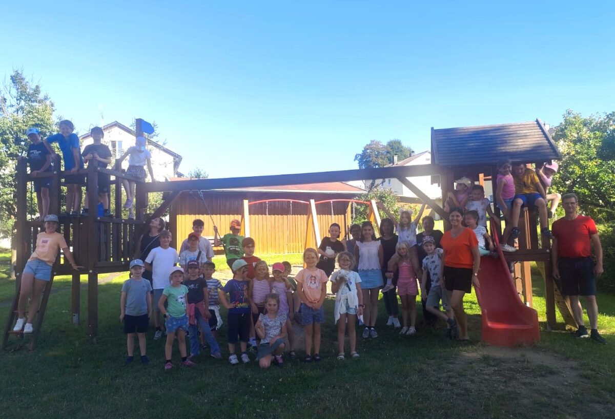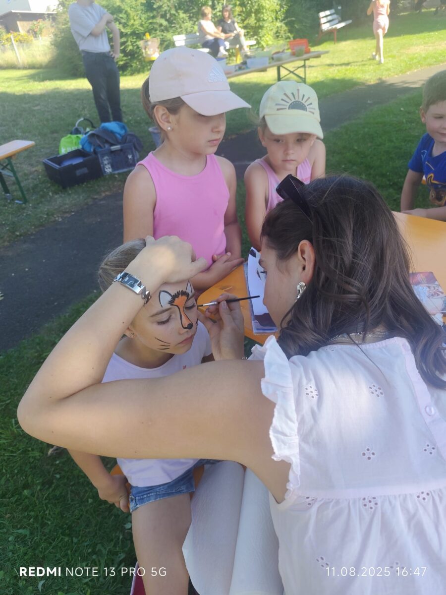 Nach der spannenden Erzähltheateraufführung suchten die Bücherei-Ferienkids wieder die hochsommerliche Wärme: Auf dem Spielplatz in der Poststraße gab es unter Betreuung des Büchereiteams mit Lorenz und Marlene Greiner, Maria Pleyer, Carola Käs, Niklas Bergler, Judith Friedl und Roswitha Schenk ein fröhliches Picknick. Wer mochte, ließ sich anschließend noch schminken – und ging bunt verziert nach Hause.