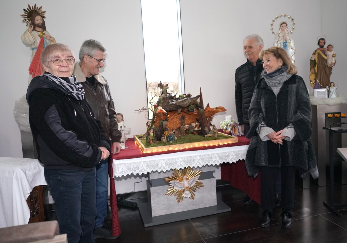 Kurz nach Weihnachten kamen jetzt Lisa und Franz Fichtl zusammen mit Hildegard Striegl-Zell, Lisa Fichtls Schwester, aus Altenstadt/WN zum neuen Seelenort am Waldthurner Freizeitzentrum. Dort übergaben sie eine von Franz Fichtl geschnitzte Wurzelkrippe.
