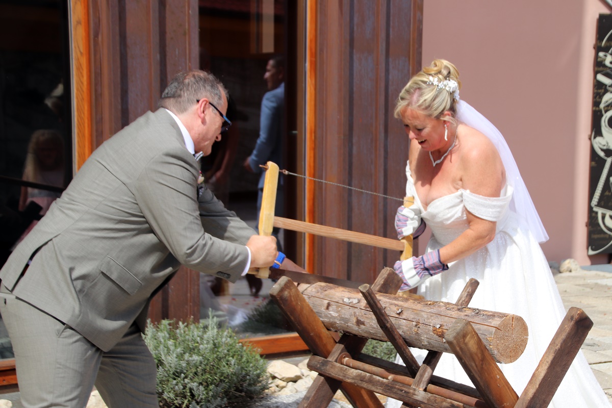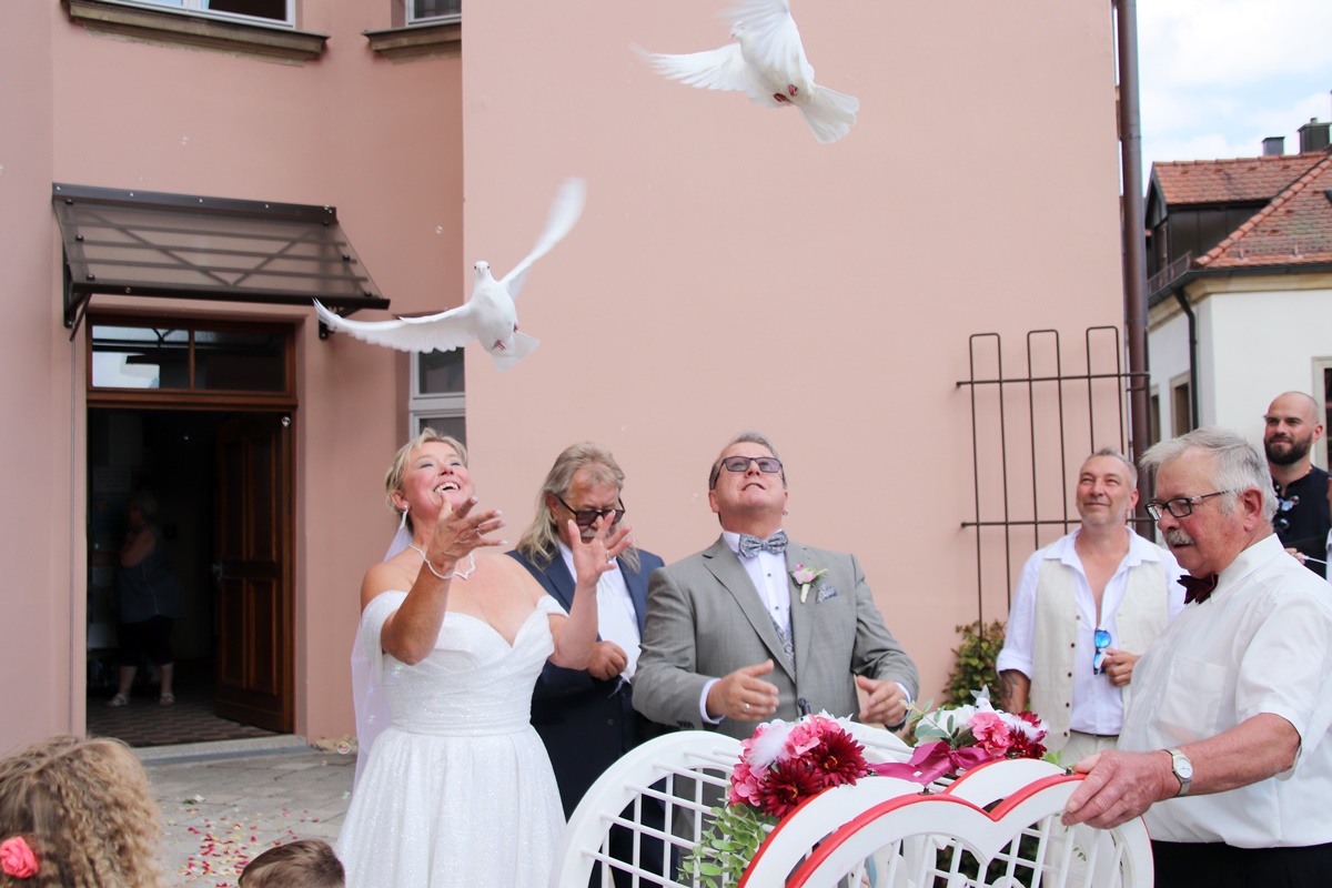 Der Hochzeitstag selbst war nicht nur wegen der sommerlichen Temperaturen von Hochstimmung geprägt. Im Hof des Alten Vermessungsamts warteten Freunde, Verwandte und Arbeitskollegen auf das frisch vermählte Paar – und hielten einige knifflige Aufgaben bereit. So musste das Brautpaar traditionell ein Herz aus einem Bettlaken ausschneiden, wobei die Schere des Bräutigams extra stumpf war, was für einige Lacher sorgte. Auch das Sägen von zwei Klötzen aus einem Baumstamm stellte das Paar bei der Hitze auf die Probe. Ein besonderes Highlight waren die Hochzeitstauben von Josef Kaufmann aus Haselbrunn, die in den strahlend blauen Himmel geschickt wurden und für eine romantische Note sorgten.