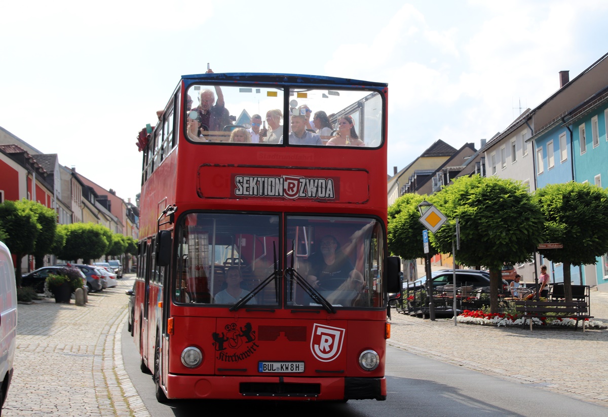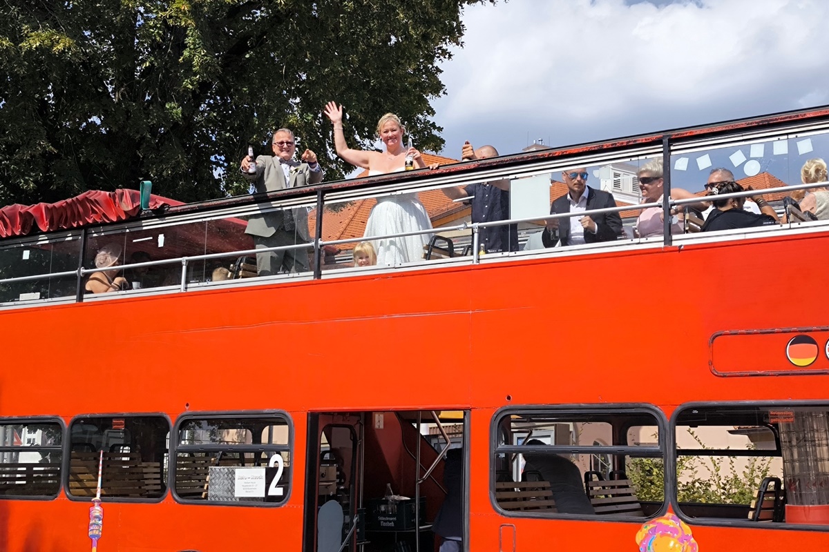 Ein besonderer Höhepunkt war das knallrote und auffällige Hochzeitsfahrzeug. Ein großer roter Doppeldeckerbus, der das Brautpaar und die Hochzeitsgesellschaft von Eschenbach nach Weiden brachte. Das auffällige Fahrzeug zog auf der Strecke sicherlich so manchen Blick auf sich.