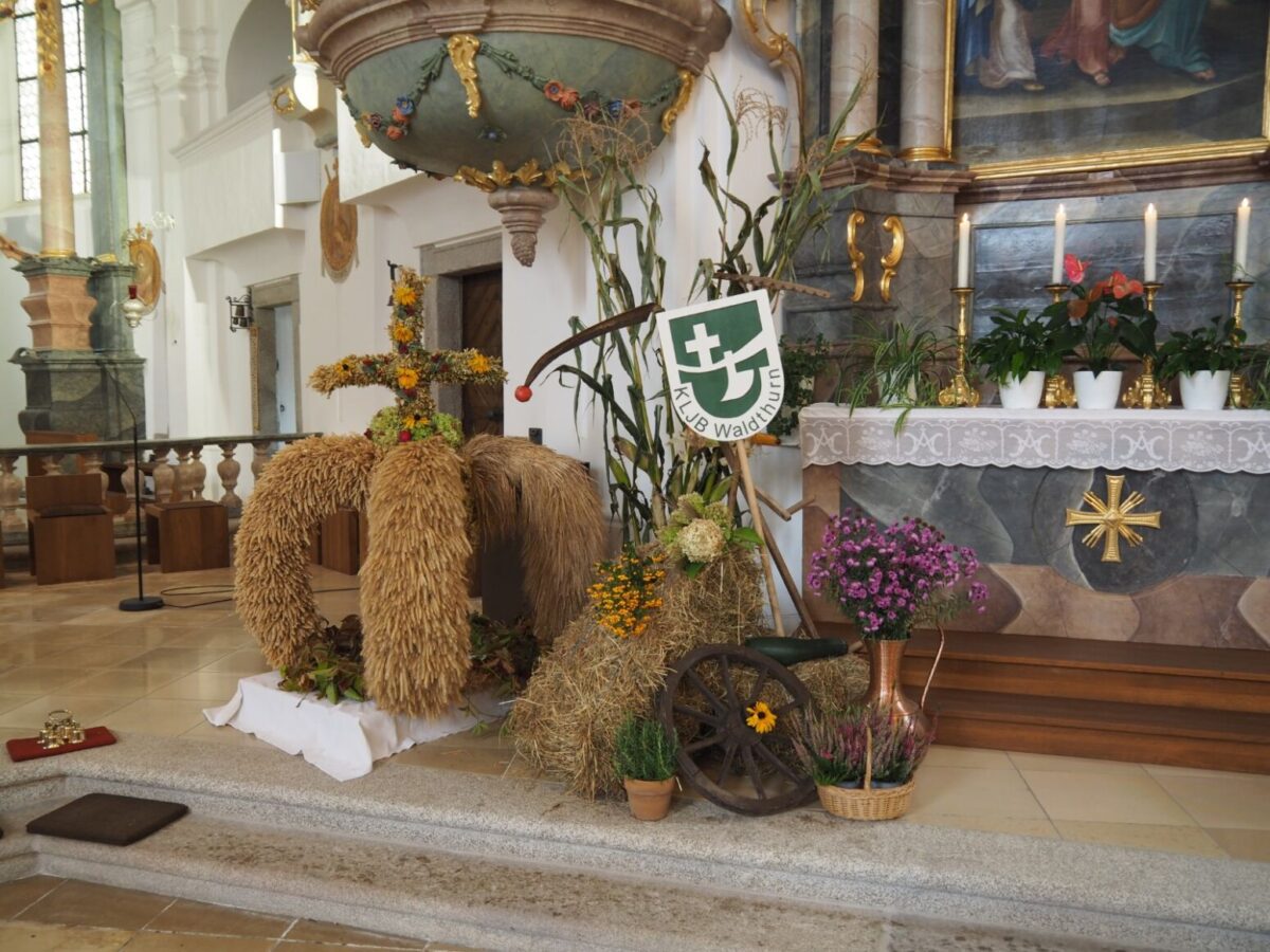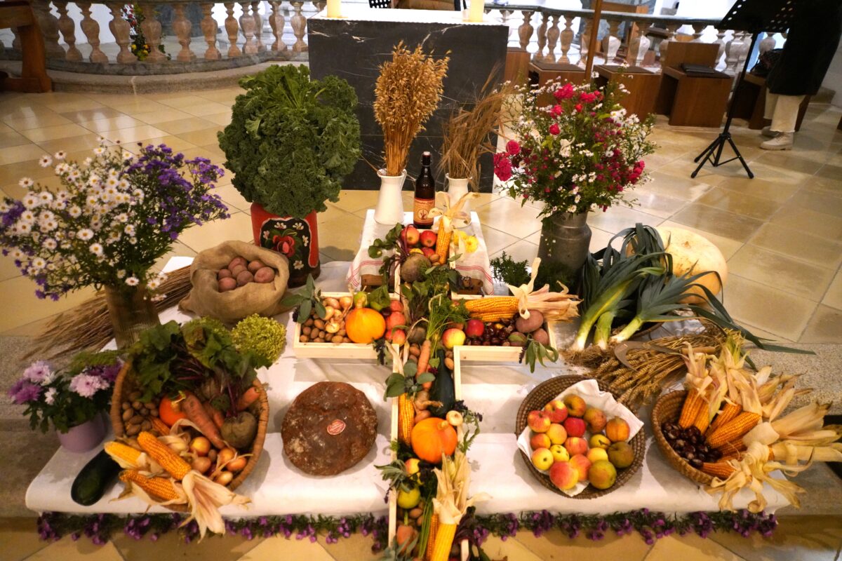 Die Erntedankmesse in der Wallfahrtskirche Mariä Heimsuchung war geprägt von festlicher Atmosphäre. Der Altar erstrahlte im Glanz der Erntegaben: Brot, Mais, Getreide, Äpfel, Erdäpfl, Weintrauben, eine große Erntekrone aus Getreide – und ein Holzkreuz, mit den Gaben der Natur bestückt. Das Kreuz stammt aus der Werkstatt der Spielberger Zimmerei Karl Greiner. Für die musikalische Umrahmung sorgten Sandro Reil an der Orgel und Sophia Mäckl an der Trompete.