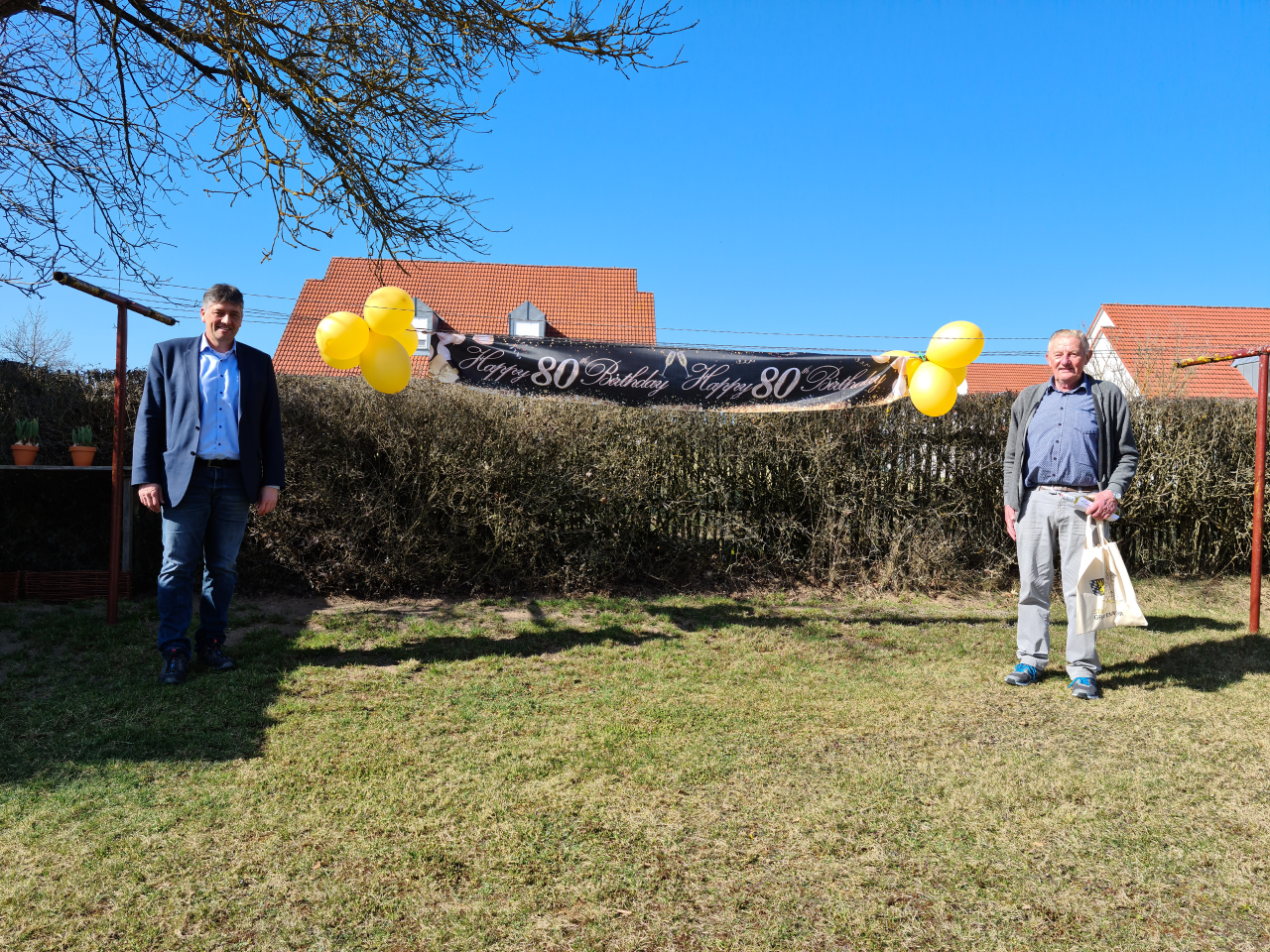 Bürgermeister Edgar Knobloch erwies Arnold dennoch bei schönstem Frühlingswetter die Ehre ihm persönlich zu seinem 80. Geburtstag zu gratulieren und übergab ihm einige Aufmerksamkeiten der Stadt – auch hier verzichteten die beiden auf das eigentlich obligatorischen Händeschütteln.