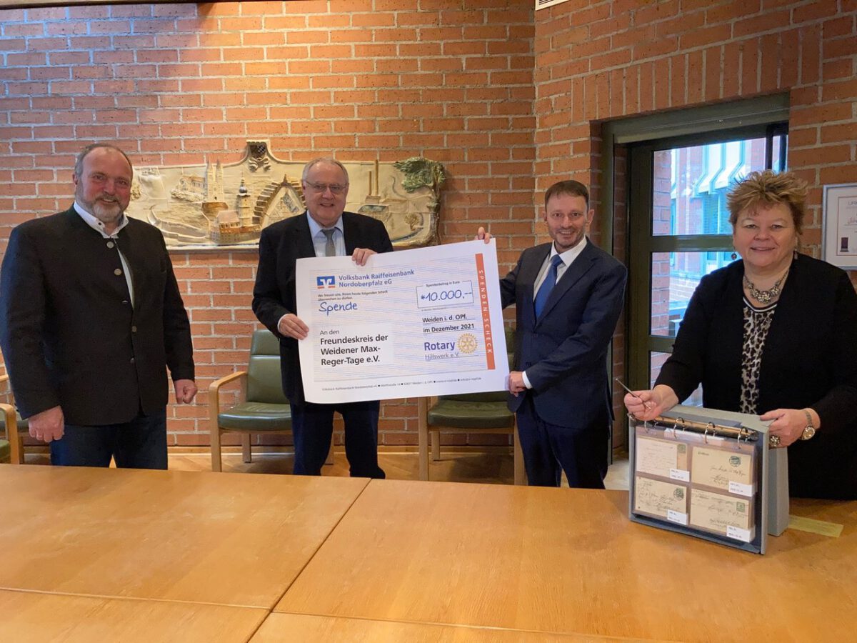 Der Rotary Club Weiden übergab eine Spende über 10.000 Euro für den Freundeskreis der Weidener Max-Reger-Tage e.V. Am Freitag empfingen deshalb Oberbürgermeister Jens Meyer, Kulturamtsleiterin Petra Vorsatz und Bürgermeister Lothar Höher, auch Präsident des Rotary Clubs Weiden, den Rotary-Past-Präsident Reinhold Gietl.