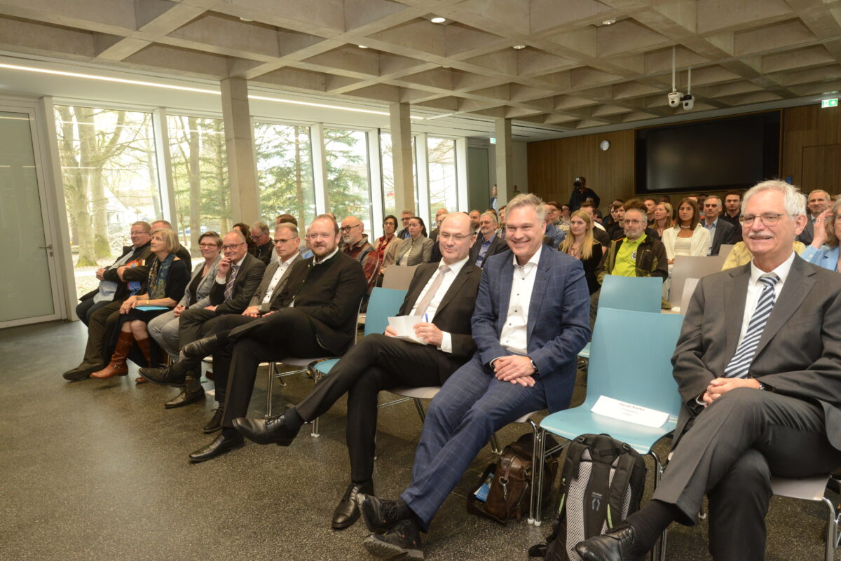 Daniel Kleffel, Präsident des Landesamtes für Digitalisierung, Breitband und Vermessung, hieß die Gäste zur offiziellen Einweihung der Außenstelle „Digitale Landkarten Bayern“ in der Stützelvilla willkommen. Die Gästeliste mit dem Bayerischen Finanz- und Heimatminister Albert Füracker an der Spitze war lang und damit der echte Beweis, dass diese Behörde für die neue Dienststelle in der ehrwürdigen Stützelvilla und dem langgezogenen, neuen hochmodernen Anbau eine ideale Lösung gefunden hat. Deshalb auch der Dank des Präsidenten an Landrat Andreas Meier für die Überlassung der Stützelvilla samt Areal für den symbolischen Preis von einem Euro und an Bürgermeister Karlheinz Budnik für die Unterstützung seitens der Stadt Windischeschenbach. Ausdrücklich verwies der Präsident auf die Personalsituation in dieser Dienststelle. „Wir haben an diesem jüngsten Standort siebzig Prozent der Kolleginnen und Kollegen neu eingestellt, was sich auch am Altersdurchschnitt zeigt.“ Zum Schluss seines Willkommensgrußes hob Präsident Kleffel nochmals das gute Verhältnis aller am Um- und Neubau beteiligten Firmen und Behörden hervor.