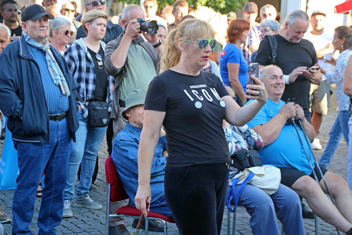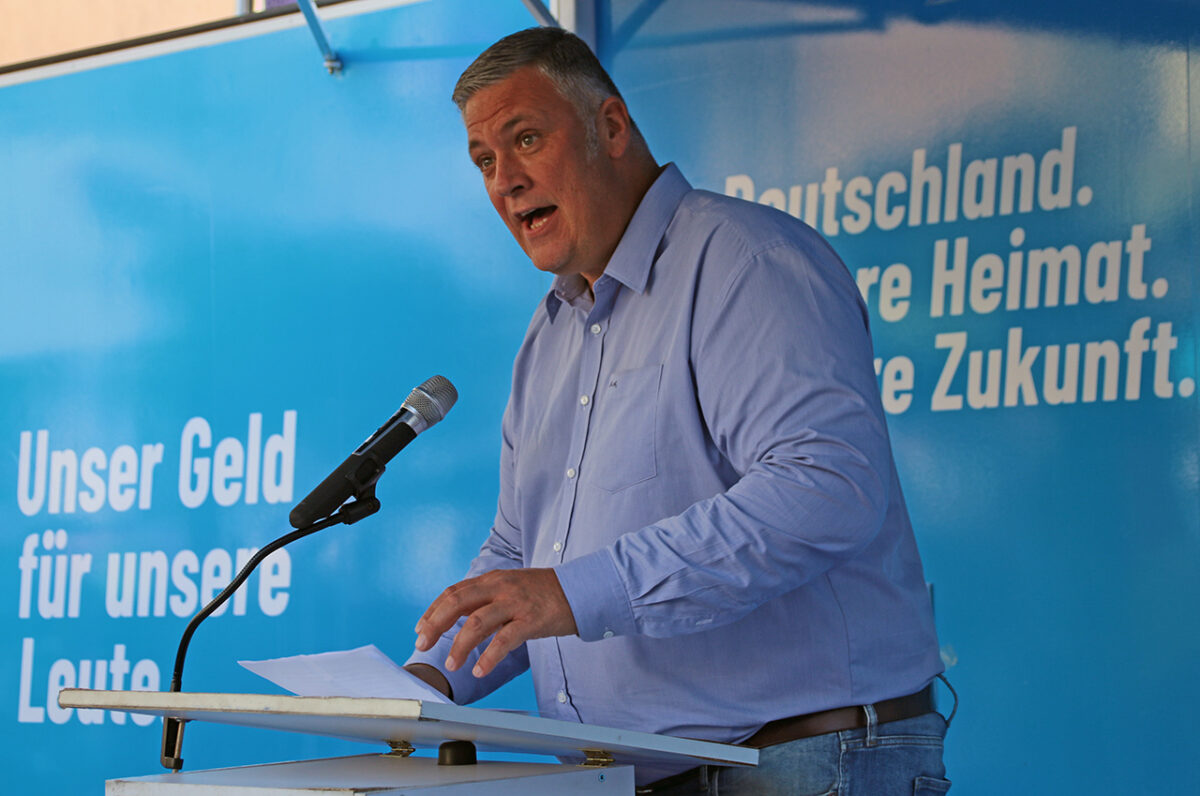 Den nächsten Part übernimmt Landtagsabgeordneter Roland Magerl. Der Weidener AfD-Koloss kämpft zu Beginn mit der Höhe seines Mikrofons: „Meine Mama hat mich ein bisschen zu gut rausgefüttert“, sagt der 50-Jährige und freut sich über die Resonanz auf dem Platz: „Verglichen mit 2018 merkt man, dass sich was verändert hat.“ Der Vater zweier erwachsener Töchter und „eines kleinen Sohnemanns“ will, „dass der so aufwachsen kann wie wir.“ Als Mitglied des Gesundheitsausschusses beklagt Magerl, dass „das Gesundheitssystem inzwischen am Krückstock“ daherkomme.