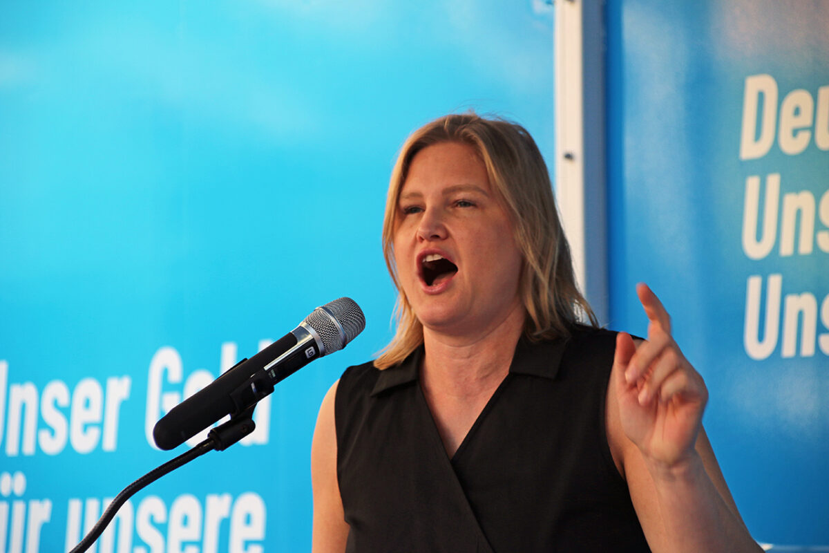 „Bis auf die linken Spinner da hinten“, für die sie auch eine Empfehlung hat: „Wenn ihr euch schon festkleben müsst, dann mit der Gosch’n“, bringt sie den Lautsprecher zum Überschlag. Auch wenn dort gar niemand Kleber dabeihat. Kein mutmaßlich volksnahes Klischee lässt sie aus: Auch mit der Parole „Schweinshaxe statt lappiger Ravioli“ weiß sie zu gefallen. Weitere volkstümliche Schlager: Schrumpfende Wirtschaft, sinkende Reallöhne und vor allem „Asylforderer, die zum Kassieren kommen“.