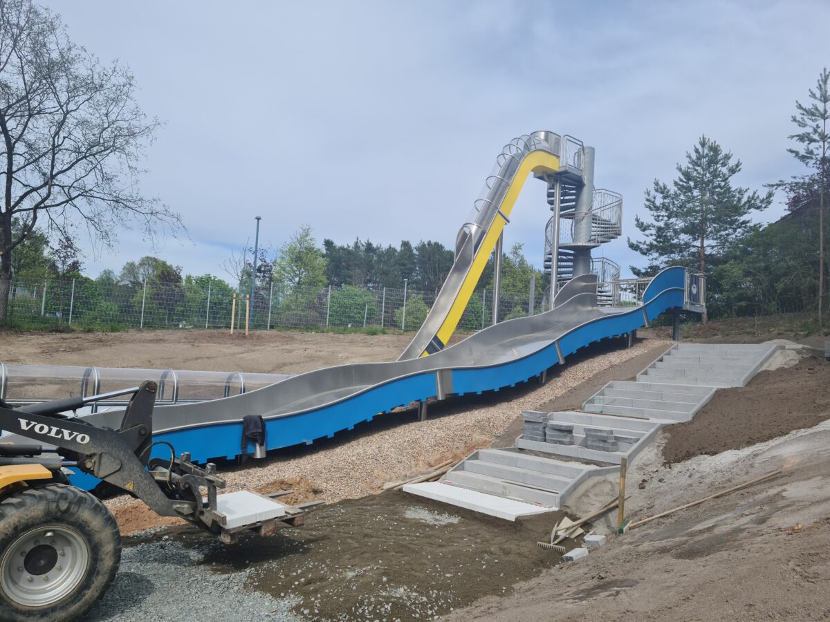 An der Wasserrutsche werden gerade die Zugänge gepflastert und das Umfeld wird gestaltet. Die Grünflächen sollen aus angesätem und Rollrasen bestehen. Die Treppen sind bereits fast fertiggestellt. Im Idealfall soll das Umfeld der Wasserrutsche Ende Mai fertig sein und damit mit Eröffnung des Waldbades fertig sein. Bürgermeister Edgar Knobloch (CSU) war bisher von einer Einweihung nach der Öffnung des Bades ausgegangen, es wird sich zeigen, ob die Rutschen dann schon genutzt werden können.