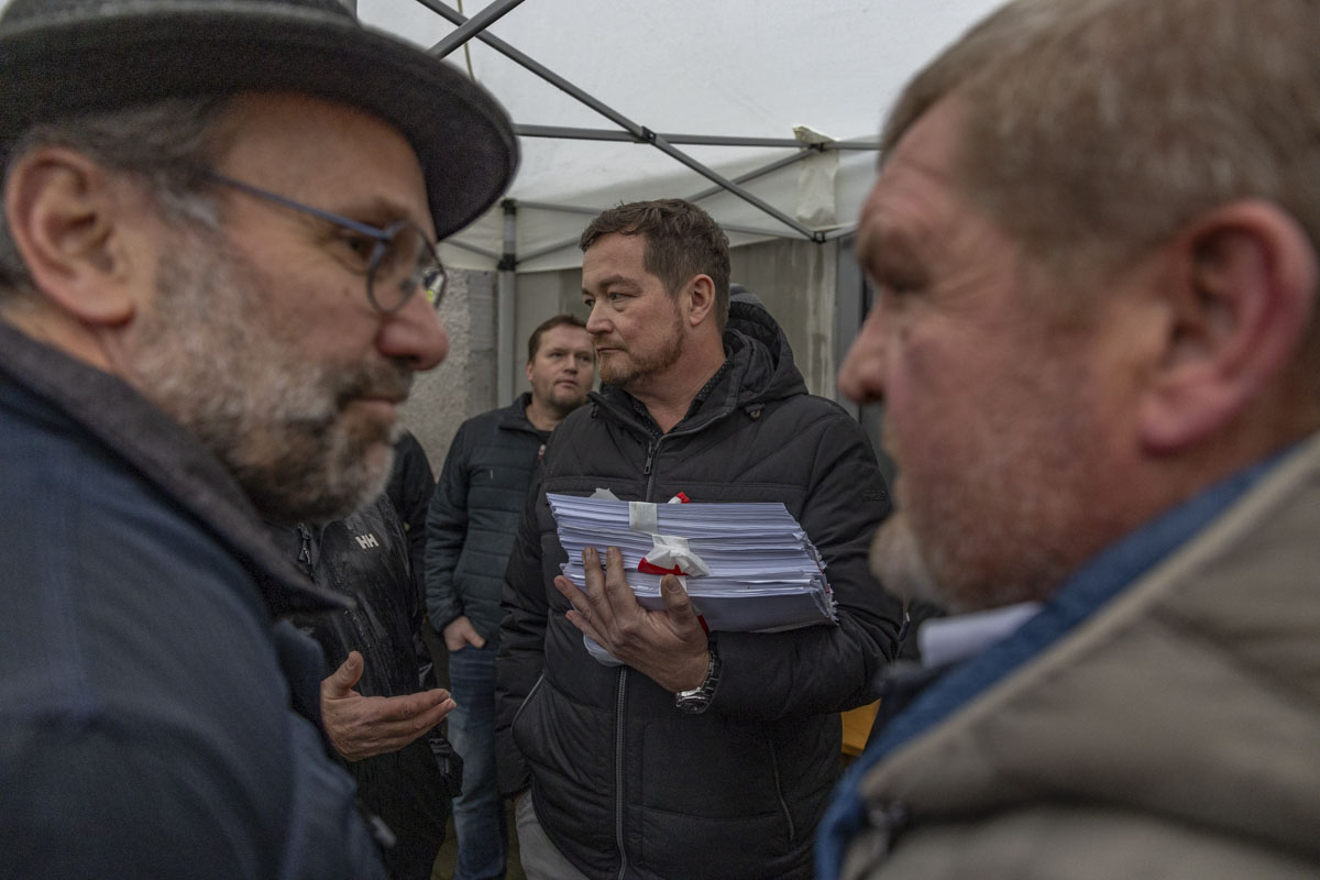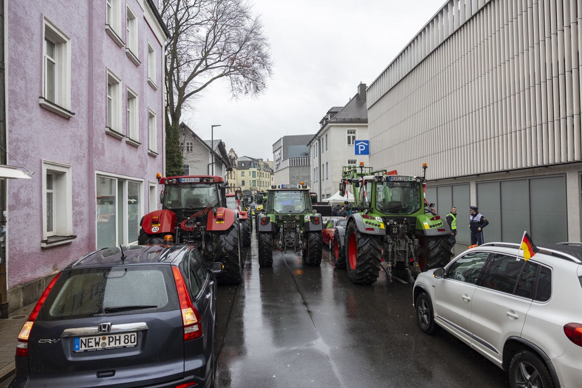 Die circa 40 Bauern und Bäuerinnen waren mit zehn Traktoren und ebenso vielen Autos laut hupend vor der SPD-Geschäftsstelle aufgefahren. Diese Zahlen waren wohl etwas enttäuschend für einige Teilnehmer: “Wo sind sie denn alle?”, sagte einer, und “Die sitzen zu Hause und schimpfen”, antwortete der andere. Vor dem Gebäude hatte man ein kleines Zelt aufgebaut, um zumindest etwas vor den Wetter-Unbilden geschützt zu sein.