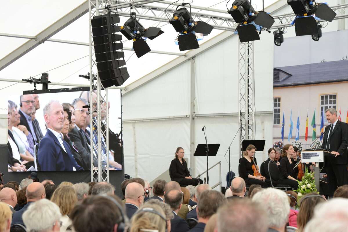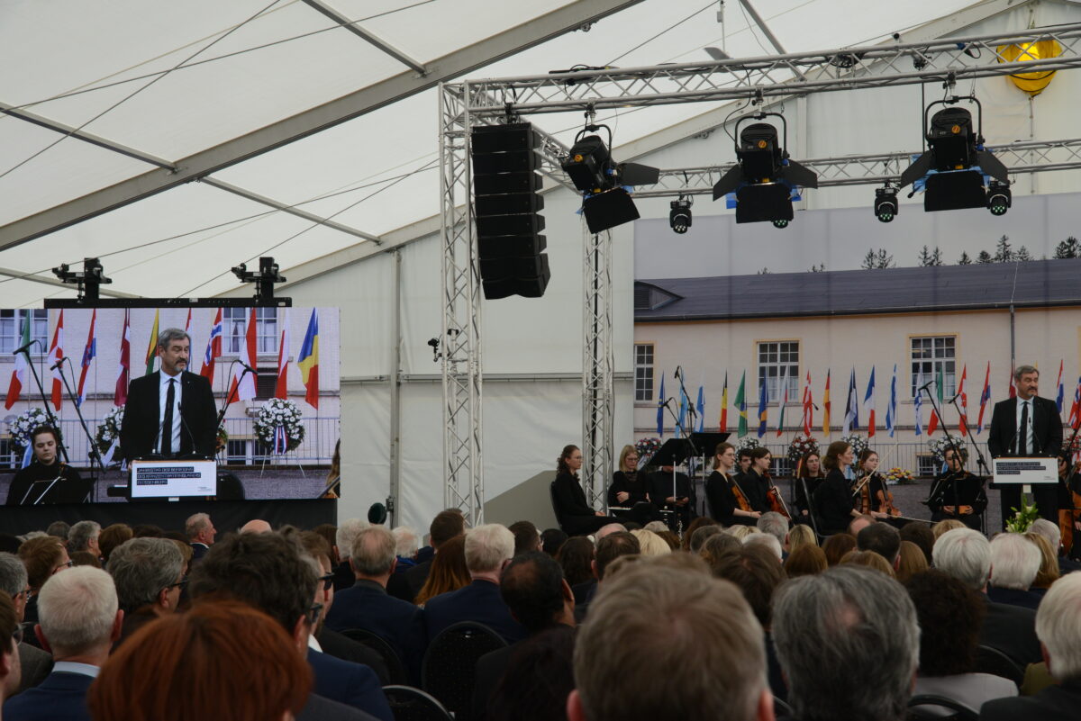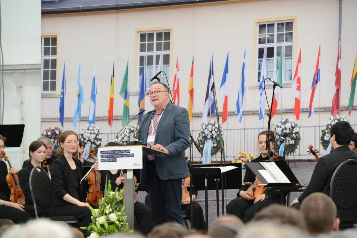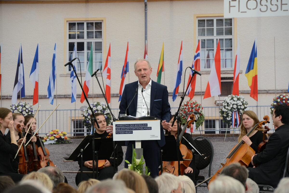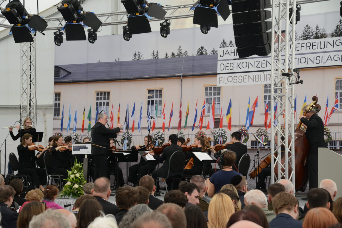 Im vollbesetzten Zelt leitete das Kammerorchester der Universität Regensburg unter Leitung von Arn Goerke mit dem Lacrymosa aus der Totenmesse von Giuseppe Verdi den Festakt ein. Dann sprach Roman Katz als Angehöriger der zweiten Generation. Sein Vater war von 4. August 1944 bis 22. März 1945 im Konzentrationslager Flossenbürg inhaftiert und trug die Nummer 15154. Mit der Verlegung ins Konzentrationslager Offenburg blieb seinem Vater der Todesmarsch erspart.